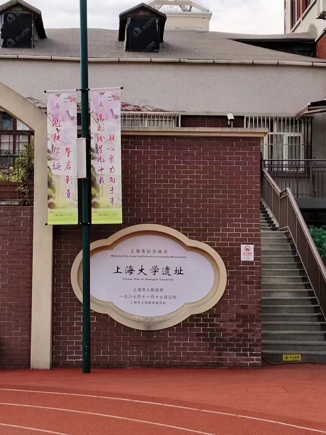 说到六十中学, 学校的六一大楼是我最难忘的,这是“上大”原址,一座二楼别墅(现在介绍“上大”的文献资料中可见其旧照)楼上是教工宿舍,底楼几级条石台阶即檐廊,西厢房是学生会,东厢房是共青团委,中间大客厅是会议室,我作为班级团支书是经常来此活动。“文革”中,六一大楼成了学生们活动中心,我们的“井岗山”总部即驻二楼,后是“红团”团部。更有逸事一桩,曾在底层楼梯下发现大理石的校碑,铭刻有蒋中正、虞和德和楊虎的名袆,为怕人敲碎,我们几人搬至食堂后的“炮兵楼”(原校工宿舍)翻放在楼梯的第一块台阶,80周年校庆时,返校时只见六一大楼及相连的学校礼堂、食堂和“炮兵楼”拆光,改建为教育产业化的“三产”公司楼,原校碑早已不知去向。呜呼哀哉,母楼最值得留存和骄傲的“上大”遗址没了,现在只是一堵遗址纪念墙而已。