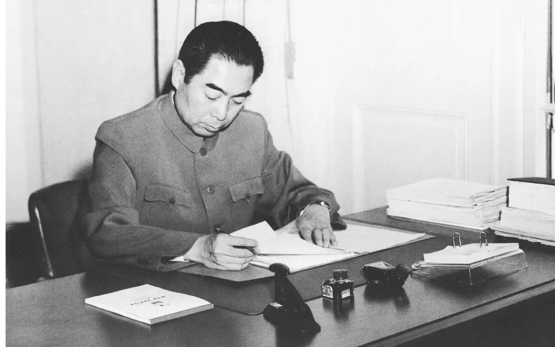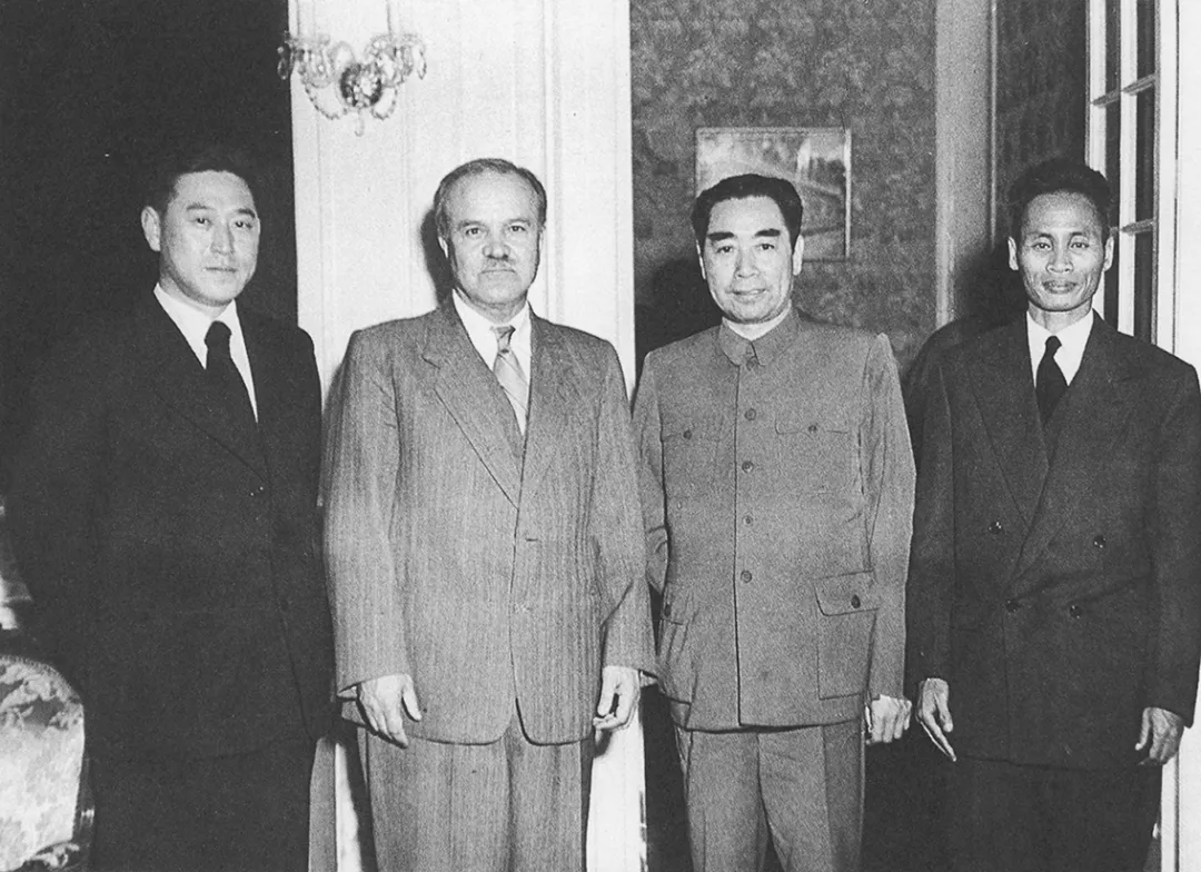 ◆周恩来与苏联外长莫洛托夫(左二)、朝鲜外务相南日(左一)、越南副总理兼外交部长范文同(左四)合影。