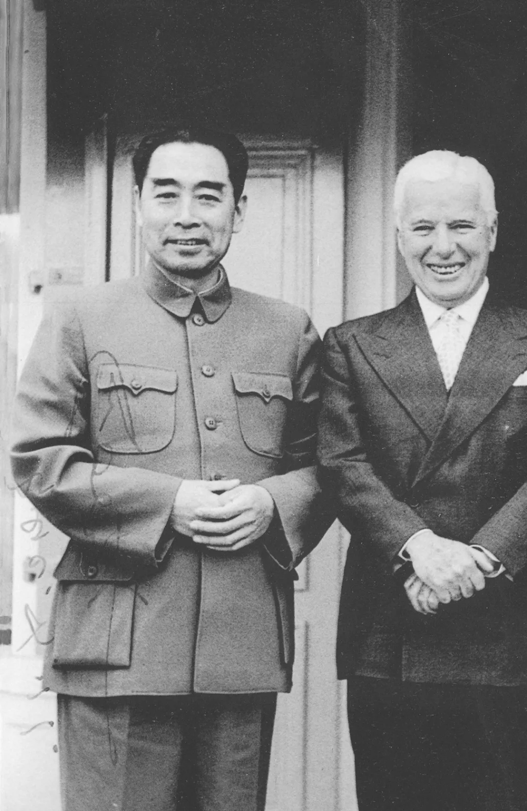 ◆周恩来在日内瓦宴请卓别林,将亲笔签名的照片赠送给他。