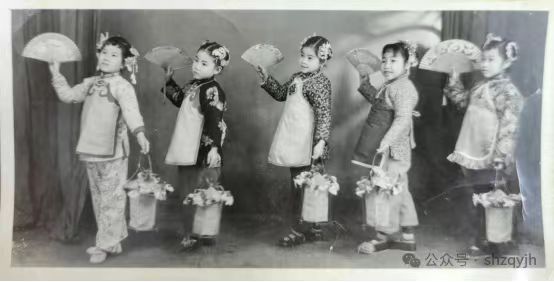 阿娘自告奋勇地承揽了为我做演出服的麻烦活。她照常要张罗操持全家一天三顿饭,晚饭后便带上老花镜,在旧报纸上画如意图案 ,画牡丹花,画飞在花丛中的蝴蝶等等,画好后剪下来贴在旧布片上作为图样。阿娘问我喜欢什么颜色,我说喜欢淡淡的天蓝色。她就带着我去绸布店,扯了三尺淡蓝色的软绸缎,摸着滑滑的,泛着微微的蓝光,真好看!阿娘不会踩缝纫机,当时缝纫机算大件物品,家里也没有置办。她做衣服全用手工缝制,针脚细密匀称,令人赞叹如同机器缝制一般。阿娘用明黄色的丝线在围裙的顶部勾勒出一个居中的如意图案,在围裙的右下方用红色、粉红色、白色绣了三朵大小不同的牡丹花和衬托花朵的七片深浅不一的绿叶子。还在围裙的左上方绣了两只正在展翅飞向牡丹花丛的白色蝴蝶。真是太漂亮了!我的阿娘虽然没有读过书,不识几个字,只会写自己的名字,但是她老人家心灵手巧,像变戏法一样,用三尺绸缎和几缕彩色丝线做成了令人爱不释手的舞台演出围裙。 这张照片是演出之后由一位家长为我们拍摄的。跳采茶舞的五个女孩中,左起第四人是我。老师和母亲为了节目的整体效果,说服动员我把自己的檀香扇换给了领舞的小朋友,我用的是别人换下来的一把不能完全打开的旧折扇