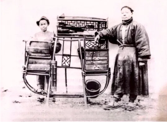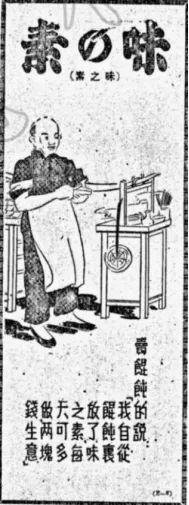 “高脚式的担子”,即马头担。而“低矮式的担子”,为“粤人”也就是广东人所挑的。 这个“低矮式的担子”是怎样的一个制作样式?笔者查检到二幅30年代上海“味之素”调味品牌的广告图片:一幅是由美国摄影师拍摄的马路广告牌,图案是以马头担为主体。另一幅是登载在《申报》上的广告图,在一副低矮式的担子下有广告语:“买馄饨的说:‘我自从馄饨里放了味之素,每天可多做两块钱生意’。”这广告语提示了我们,这副简单轻便的担子就是馄饨担,而且就是广东人挑的低矮式的馄饨担。这个调味品为求经济利益最大化,充分突显了平民化意识,在其广告设计的多种图案中就有采用普通大众最喜欢的馄饨担作为主体对象,并将二副不同的馄饨担分别制作成了不一样的广告图案,为我们后人留下了认识广东人馄饨担的大概图像。 ![]()