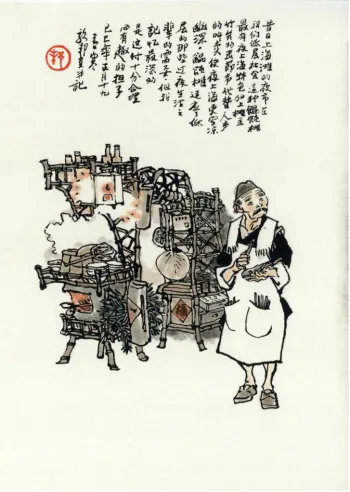 到了上世纪60年代,熟悉的“卜卜卜”声渐渐稀疏了,弄堂里的馄饨担和其他小吃担大都转而设摊在过往行人多的街上路旁。终于在一个年月,消遁的无形无踪。 80年代后,夜上海的活力强劲重现,个体的宵夜小吃亦悄然重新回归街头。然而“马头担”却已成为了过去,取而代之的是一部手推车、一辆黄鱼车,在街旁角落,摆开低矮四方桌凳,吆喝着宵夜人。炉膛里的柴爿“噼啪”作响,风挟着星火点点急不可待地向四周散开。一时,“柴爿馄饨”、“砂锅馄饨”重新唤起老一辈人的记忆,又招引来新一代的宵夜人。 时至今日,长辈中说起以前的馄饨担还是令人难以忘怀。95岁的老父亲聊起上世纪50年代时工作至半夜去街头摊位吃宵夜的情景,特别是馄饨担人包裹小馄饨时那种展开馄饨皮、竹片一刮、手指一捏娴熟的手势,仍然历历在目。我的老师记忆中仍留存着50年代读初中时,在学校晚自习后的回家路上为能遇到馄饨担,吃上一碗飘香鲜美的小馄饨而从心中溢出的那种慰藉愉悦感。 我生也晚,我们生于50年代后期的人对于弄堂里的馄饨担没有任何印记,它对于我们太陌生了。我们这一代同龄人初识这副馄饨担,可能大都是缘于沪上大画家戴敦邦的在30多年前画的一幅馄饨担。在戴敦邦的印象里,“昔日上海滩的夜市在我们底层社会这种馄饨摊最有夜上海特色,加上摊主竹爿的击节声代替人声的叫卖使夜上海更空凉幽深,馄饨摊适应了底层的那些过夜生活之辈的需要,担我记忆最深的是这副十分合理而有趣的担子。”画中的馄饨担栩栩如生如昂首的马头,尽显其一百多年来之风姿,堪为经典。 随着现代化城市的发展,生活环境的变化,馄饨担及众多的小吃担早已远去。这虽是我们这个城市的历史必然,但馄饨担包括所有的小吃担子都曾是这个城市发展史上的一个段落、一节篇章,它对于城市的社会发展所起的重要作用,是我们不能忘却的。 ![]()