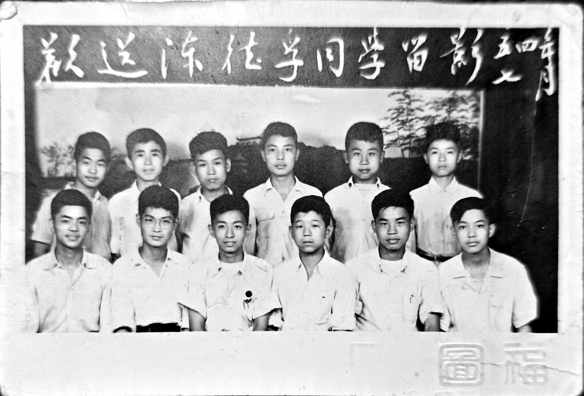玩伴中最要好的是住七号楼上的李国忠,我俩又是北郊中学初中部同班同学,(第一張集体照片上排右一是我,左一是李国忠)因为北郊中学须家住市中心的学生可住校,我俩家在招商二邨只能是走读生,每天早晨我在七号楼下喊他一同走向北郊中学,放学我俩一同回二邨家中,初中三年天天如此。第二张照片也是好玩伴,因年久他的姓名已忘(恳请网内朋友如认识他请告知姓和名)他家是解放后1950年或1951年入住二邨,記忆中其父是南下軍队干部,可能负伤常年在家休养待人十分和气,玩伴性格豪爽,约1953年送我这張二吋照,我同他开玩笑在照片上写下CCCP四亇字母,比喻那时苏联体育运动员的字母符号,还有一位可能叫黄以明的同伴,(那二位同伴家记忆住右第二条支弄)加上李国忠和我四人常在弄堂内吹口琴合奏,引起二邨大人小孩的关注!