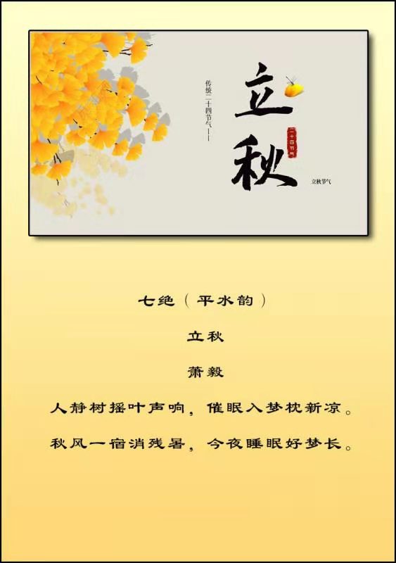 ![]() 五律(平水韵) 立秋 今夜凉风起,枝摇帘动轻。 暑天收夏色,梧叶响秋声。 露白莹珠滴,簟凉荻竹清。 阴凉身背透,梦境入幽情。 七律(平水韵) 立秋 萧毅 连日高温难入睡,升腾热气似蒸笼。 霜星光泻洒庭院,雪月烟笼照夜空。 人静夜深消暑气,枝摇帘动起清风。 梧桐叶落秋声响,头枕清凉入梦中。 七绝(平水韵) 立秋 萧毅 人静树摇叶声响,催眠入梦枕新凉。 秋风一宿消残暑,今夜睡眠好梦长。 七律(平水韵) 立秋 萧毅 昨天风扇转无停,今日商飙早已惊。 三伏暑天收夏色,梧桐枝叶响秋声。 清晨朝露窗飘湿,夜晚暮风帘动轻。 吹散高温流火尽,立秋竹簟渐凉生。 注:该诗被刊载在《上海老干部工作》杂志2020年第10期“艺林漫步”栏目。 ![]() |