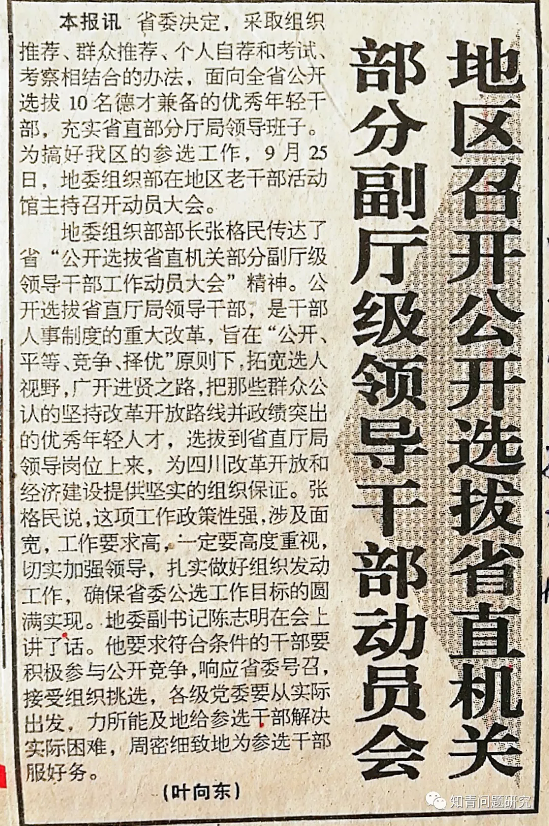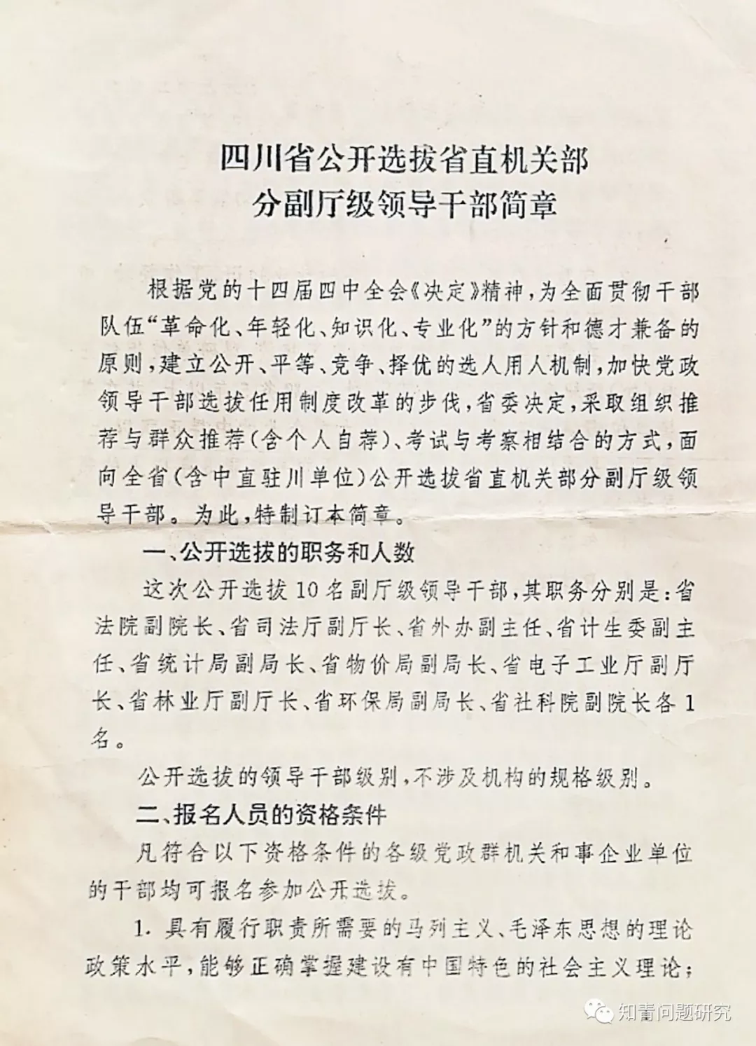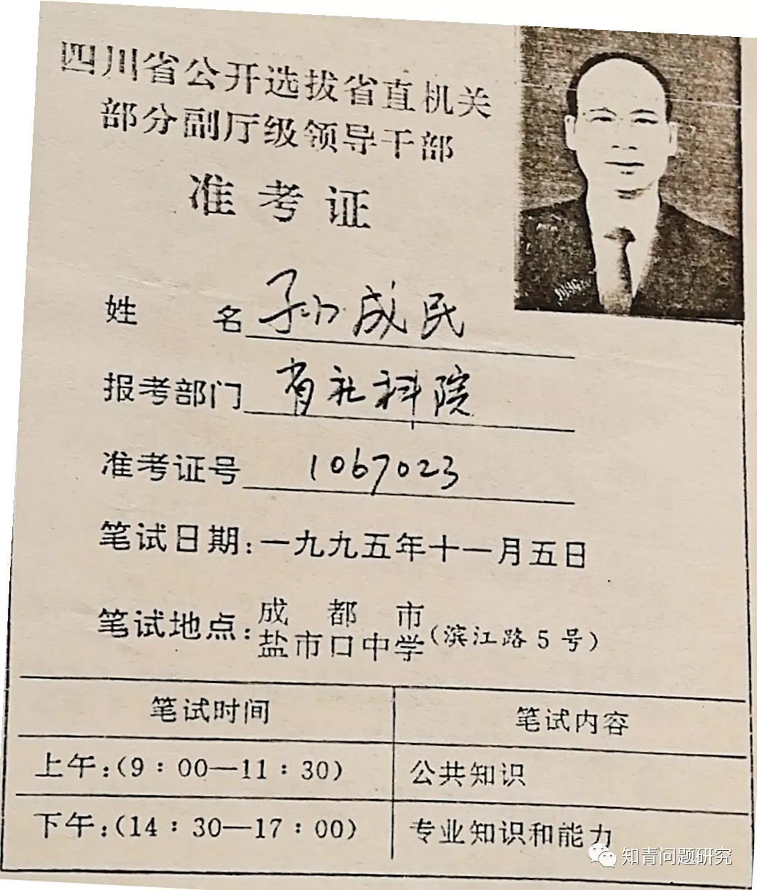 ![]() 1995年9月,四川省委启动了公开选拔10名副厅级领导干部的工作(以下简称“公选”),历时3个多月。这是自改革开放以来,四川首次面向社会公开选拔副厅级领导干部,其“公选”规模、层次、影响在全国有较大影响。我作为报考者,有幸参与这次“公选”从报名、笔试、面试、考察等环节的全过程,最后被录取担任了省社科院副院长。 一、得知“公选”信息 这年9月18日,《四川日报》在第一版刊出了省“公选”《简章》。报道称:省委决定采取组织推荐与群众推荐(含个人自荐)、考试与考察相结合的方式,面向社会公开选拔省法院副院长、省司法厅副厅长、省社科院副院长等10名副厅级领导干部。其报名资格、选拔办法、笔试考试、面试答辩、时间安排等均在《简章》中作出明确公告。消息发出后,立即在全省乃至全国引起较大反响。 当时,我在达川地委(今达州市)政研室工作,正忙于相关文件起草,直到9月25日地委组织部召开动员会议时,我才正式得知这一信息,并仔细听完了动员报告中的“公选”办法及资格条件。地委要求“全区符合报名条件的干部都应积极参与,其考试情况作为今后提拔使用的一个重要参考”。说实话,此前我并没有打算报名去参加这样一次考试,更没有考虑自己“晋升”的问题。在听取地委的动员报告后,我又不得不再次作出认真思考。 ![]() 二、进行自我评估 对照报名资格,我作了一下自我评估,其中几个基本条件是符合的。从任职年限来看,担任地委政研室副主任4年后又担任主任3个年头了,符合“担任正县级职务3年以上或副县级职务5年以上”的要求;从基层锻炼来看,下乡插队落户9年期间担任过公社党委书记两年后又在县委工作3年,符合“在基层单位锻炼1年以上”的要求;从年龄状况来看,已年满44周岁,符合“1951年1月1日以后出生”的要求;从文化程度来看,参工后到西南师范学院中文系干部专修班脱产学习两年并获取大专文凭,符合“具有大专以上文化程度”的要求。 仅管符合报名基本条件,但我并没有多少信心去参加这次公开“亮相”,因为我对自己的基础与实力是再清楚不过的了。1967年初中毕业不久,就上山下乡到开江县红岩公社4大队插队落户。由于父母都是教师,“坚持学习、必有好处”的教育使我刻骨铭心。在繁忙的生产劳动和艰苦的生活磨练中,我没有放弃学习,自学了初中、高中的语文、数学课程,阅读了哲学、政治经济学、科学社会主义等教科书籍,还学习了一些马列著作和毛主席著作,写下了数十万字的学习笔记和日记,也在农业生产实践和科学实验中发挥了一定作用。想不到的是,省委(1973)92号文件还对我的学习和锻炼给予了表彰。在农村学是学了不少,但系统性不强,还不扎实,我是心知肚明的。 ![]() 1978年6月,我离开农村调到县上工作。此后,尽管工作一直忙忙碌碌,还有结婚安家之个人大事,但“恶补”学业、探求新知,却是我始终的向往与不变的追求。我上过“函大”、读过“刊大”,也想着有朝一日到大学深造。说来也巧,1983年我调到当时的达县地委办公室工作已两年多了,全省组织人事部门在西南师范学院中文系开办一个干部专修班,报考名额分配到各地后需到“西师”进行一次文化考试。不知怎的,我并不在单位推荐的名额之内,可能一个重要理由就是因为我是“初中生”。在要求单位先行考试一次再推荐名额的呼声下,我才被确定为“可去试一试”的人选。殊不知,这一考,在全省的名次我不清楚,但在全区的这批考生中还处于前列,被录取了。通过这次检验,使我对自己的底细有了较清楚的认识,也摸到了我们这一代人学业水平的实际状况。可以说,这是我对参加全省“公选”能够增强信心的一个重要因素。 ![]() 三、选择报考职位 无论是“组织推荐”还是“个人自荐”,都要填写“报名及资格审查表”。这张表中,有一个栏目是“选报单位及职务”,经权衡比较,我选择了“四川省社科院副院长”职位作为第一志愿。 之所以选择报考省社科院的职位,主要是考虑到我当时所从事的工作与社科院有许多接近或相通的地方。特别是我已在地委政研室工作了15年之久,担任领导职务也已7年多时间。这些年来在地委决策研究和咨询部门工作,承担了较多重点调研课题和重要文件、报告的拟草工作,在实践中逐步提高了政策理论水平,也拓宽了知识面。与此同时,较长时间从事政策研究工作,在某种程度上说,已成为了我的一种工作兴趣,对社科研究有着独特的偏好。 还有一个重要因素是,我与省社科院曾有一些工作接触。1994年4月,我担任政研室主任还不到半年,省社科院派员到地委联系工作,主要是来商议筹建“省社科院达川分院”的事项。随后,我抓紧拟草报告,经地委讨论同意后,转送省社科院批复。不到1个月时间,四川省社科院达川分院正式挂牌,由地委分管副书记兼任院长,我担任常务副院长。这年9月,我被省社科院聘为特约副研究员,此后,又参加了省社科院的一些研讨会,参与了一些专家学者的调研工作等。这些接触与活动,使我天然地加深了对省社科院的情感。 ![]() 四、做好应考准备 既然已经填交了报考志愿,就要按程序“走下去”了。1995年10月26日,也就是在参加动员会之后一个月,报名资格审查名单经省批准并正式公布。全省报名参加这次“公选”共627人,经审查符合报考资格的有484人。