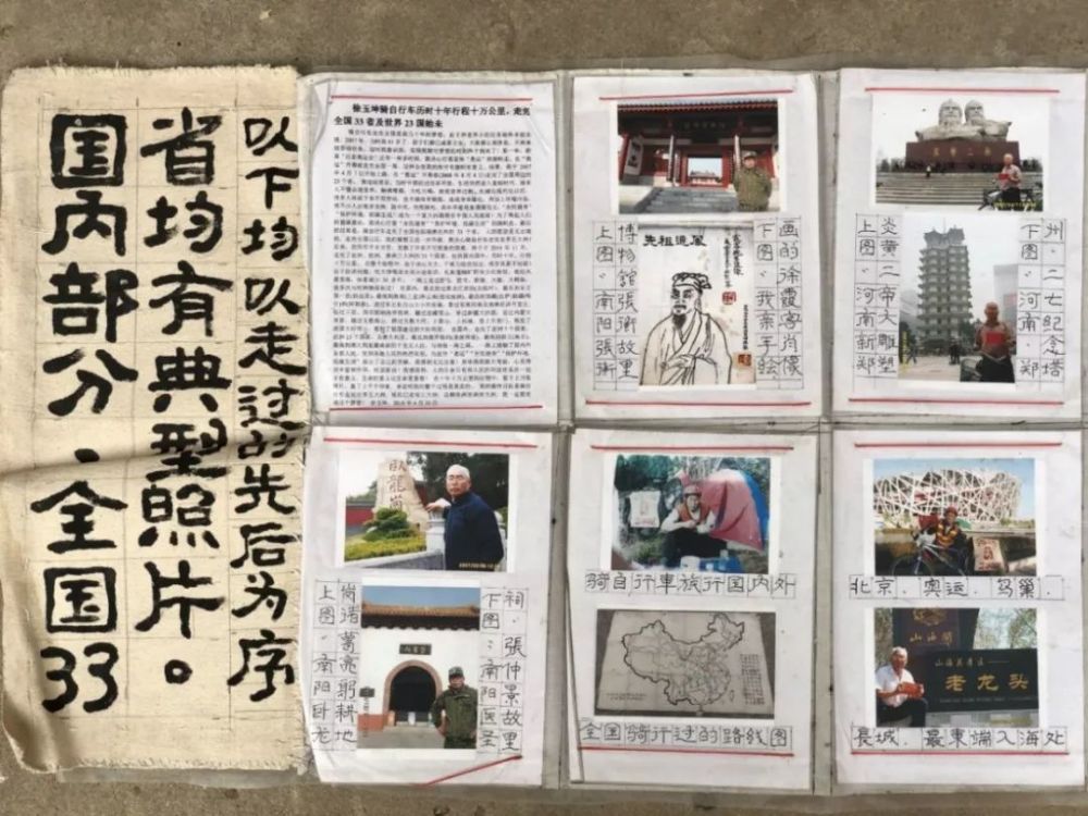 唯一不反对的是老张。老张有过一瞬间的想法,想和徐玉坤一起走,但他丢不开手上看大门的工作。其实他也不理解徐玉坤的理想,他对徐玉坤的判断依据来源于:他写了一手好字,总是义务给村里墙上写印刷大字,这样的人一定是好人,没有坏心。总有闲言碎语传到他耳朵里,说徐玉坤疯癫了,瞎折腾,他怼回去:“你懂什么?就知道坐井观天!” 老张如今81岁了,别人说话不太听得清,徐玉坤和老伴提着水果去看他,大声喊话谢他:“老哥,当年是从你这儿打响了长征第一枪,多亏了你!”老张呵呵地笑,话题总是不自觉地转移到自己对于免费帮人看病的愿景上,临走前说了一句:“我挺羡慕你。” 第一次骑行回家,家人们想了很多方法阻止徐玉坤的再次出发。他们把他的钱没收了,又偷偷把他的相机藏起来,以为这样父亲能安分下来。但这一招没有奏效,2007年10月,徐玉坤取出自己私藏的1500块小金库,花1420元买了一个新的卡片相机,在全身只有80块钱的情况下,再次出发了。 “我太压抑了” 徐玉坤问过自己那个所有人都在问他的问题:为什么一定要上路去?他给自己的答案是:“我太压抑了。” 五岁的时候,徐玉坤的母亲去世。1959年,中国三年经济困难时期,徐玉坤的父亲双目失明,当时徐玉坤13岁,刚上完五年级,他还有四个哥哥姐姐,都已经参加工作离开溧河店,照顾父亲的责任自然而然地落在他肩上。徐玉坤因此离开学校,回家务农。 徐玉坤的四个哥哥姐姐全都脱离了黄土地,两个进了工厂,一个是教师,一个是土产公司职工。他原本也想出门打拼,读书时,他的成绩是班上前几名,字写得好,也爱写文章。但照顾父亲的重担把他拖住了。 “只有在家务农和照顾父亲是我应该干的。没人照顾,他一天也没法生活。”徐玉坤说。 父亲离不开他,父亲去世后,妻儿离不开他。徐玉坤打心底里羡慕哥哥姐姐,“我啥时候能出去,能走得更远?”从回家务农开始,这种想法就在徐玉坤心里埋下了,他还想上学,不甘心。 二女儿徐海棠幼时对父亲的印象,感觉他总是在给爷爷做饭。她觉得父亲性格果断,说一不二,并且总是为别人着想。她记得小时候,父亲当过大队民兵营长,村里每次有进厂工作的名额,父亲总是优先分给其他人,“其实他自己也有资格去的,他总说这样不好”。 徐玉坤的心老是在溧河店之外。他养成了练书法的习惯,平日里爱写点文章,《河南日报》是他最爱看的,他不太关心生活琐事,喜欢关注国家大事、政策方针、社会名人,愿意跟朋友聊些国家层面的话题。 “我总觉得一种压抑,劳动中总是不想服输,生活总是不开心。”徐玉坤说。 ![]()