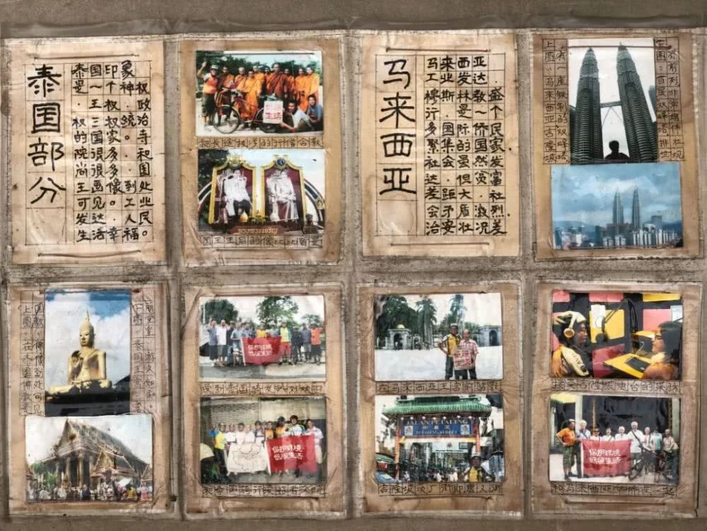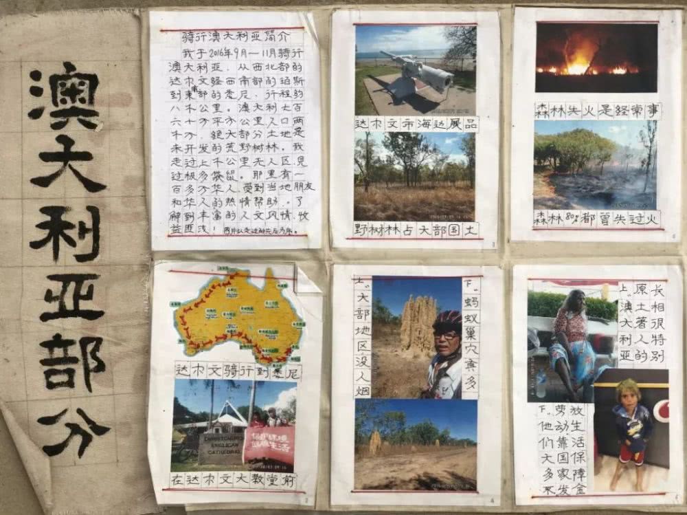 他有时候看着自己身边的环境,对这种生活感到震惊。这原来是农村,现在是城中村,人口几十倍的增长,“这些年死了好多年轻人,六十岁以下的年轻人不下五十个,一年两三个”。他留意到,“人死了,大家就不以为然,死了就埋,埋了谁也不说。” 侄子的经历让他反思人的生存方式。37岁那年,他侄子脑出血倒在麻将桌上,落得半身不遂,走路一瘸一拐。在溧河店,打麻将是最为常见的生活方式,包括年轻人。他看着身边的人“虚度时光”,“我不能这样,我必须干我想干的事”。 到了四五十岁,所谓的中年危机时期,被压抑的心理越来越焦灼,想走出去的愿望越来越强烈,徐玉坤开始睡不着觉,夜夜失眠,到了梦寐以求的程度。他想上路旅行,想看看别的地方是什么样。 同样的几个问题,在徐玉坤脑子里整年整年地绕,落灰一样,一层一层积成了一堵墙,最终爆发了2007年那次“出逃”。他做过许多自我反省,其中一个是:同样是面朝黄土背朝天,都被压住了,别人为什么就没想冲出去,怎么就你想了?他想不明白,最后给了自己一个答案——大概是一种天性吧。 没吃的,他煮了三只被撞死的袋鼠 第一次出国,徐玉坤没有经验,不知道怎么办签证。他花了将近一年的时间才搞清楚:先是骑了几千公里到新疆喀什,想进入吉尔吉斯斯坦和哈萨克斯坦。在那待了半个月,被告知无法办理,又转到北京的大使馆,才明白出国原来要很多的条件。要收入证明,要银行流水,要邀请函,很多是他没有的。又过了几个月,他终于在旅行社的帮助下,办了去东南亚的签证。 在国外,最困难的是语言问题。最初几年骑行东南亚,徐玉坤每到一个地方,首先要找到华人,让对方帮忙换当地货币,买电话卡,然后按着导航骑车。后来有了翻译软件,语言问题基本解决。最大的困难变成充电。在国外,没有导航,徐玉坤一步都不敢走。 每次旅行回家,他都手绘一张大地图,把走过的路线仔细标好,海洋的地方全都涂成蓝色,跟买来的地图一模一样。他每天都写日记,记录这天的路途和遭遇,一次旅途是单独的一本。专门用来盖邮戳的笔记本上,他仔细地画好每个邮戳应该占的区域,盖上之后,再写上当地的地名,以免日后不认识。 徐玉坤用一种愚公的方式进行他的旅程。 ![]()