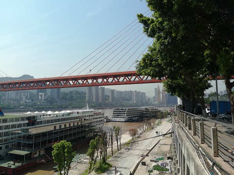 ![]() (朝天门码头) ![]() 接着,我们坐横跨在长江上的索道上的空中缆车,在高空俯瞰重庆市容,觉得重庆人真是会做生意,索道上的空中缆车原来是很多年以前缺乏桥梁时的过江交通工具,而现在重庆的长江和嘉陵江上都已经造了几十座桥,不需要过索道坐缆车了,这过江缆车就成为了一个很好的特色观光旅游项目,不失为赚钱和富有重庆特色的一张名片。缆车很平稳,能站二三十个人,四面都是玻璃,看得很清晰,长江两岸原本高耸入云的楼群好像在脚下成为一大堆积木,其中有几幢新的尖顶建筑涂成金色,在阳光下闪闪发光。 接着,我们坐旅游大巴马不停蹄地赶往著名的红色旅游景点白公馆和渣滓洞。这是规定好的、所有的旅游团队都必游的项目,我们也以对革命先烈无比崇敬的心情登上了歌乐山。 ![]()