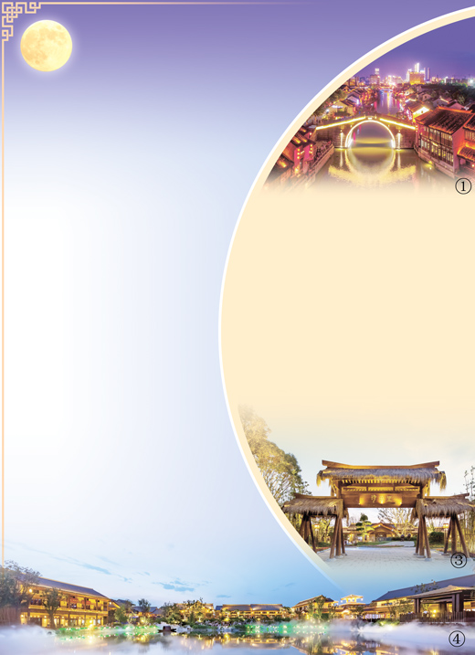 图①:夜灯下的无锡清名桥。资料图片 图③:沣东新城诗经里小镇山门。本报记者 张丹华摄 图④:沣东新城诗经里小镇,灵沼湖烟波浩渺。本报记者 张丹华摄