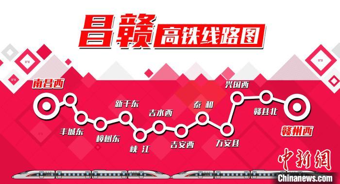 京港高铁南昌至赣州段将于12月26日开通运营。图为昌赣高铁线路图。南昌铁路 供图 京港高铁南昌至赣州段将于12月26日开通运营。 12月24日,澎湃新闻记者从中国国家铁路集团有限公司获悉,京港高铁南昌至赣州段(以下简称京港高铁昌赣段)将于12月26日开通运营,井冈山革命老区、赣南等原中央苏区迈入高铁时代,江西省实现市市通动车。 京港高铁昌赣段自南昌枢纽引出,沿既有京九铁路向南延伸,经江西省丰城市、樟树市、吉安市、兴国县、赣县区至赣州市,线路全长418公里,设计时速350公里,设南昌、丰城东、樟树东、新干东、峡江、吉水西、吉安西、泰和、万安县、兴国西、赣县北、赣州西等13座车站,初期运营时速300公里。 京港高铁昌赣段开通运营初期,铁路部门将安排开行动车组列车18对。2019年12月30日全国铁路运行图调整后,将安排开行动车组列车日常线31对、周末线2对、高峰线5对。南昌至赣州间最快运行时间1小45分。 据了解,京港高铁昌赣段开通运营前,国铁集团精心组织相关单位,严格各项规定和标准,对该高铁各专业设备进行了联调联试、检测验收和安全评估,对轨道状态、弓网性能、列车控制、通讯信号系统等进行了综合优化调整,满足了高速铁路安全、稳定运营要求,目前已具备开通运营条件。 京港高铁是我国“八纵八横”高速铁路网中的重要“一纵”。此次开通的昌赣段,北端在南昌枢纽与沪昆高铁、昌九城际、向莆铁路、在建昌景黄高铁连接,南端在赣州与赣龙等铁路连接,并通过在建的京港高铁赣州至深圳段延伸至深圳,形成江西省以南昌为中心的“十”字快速铁路网,构建鄱阳湖地区与粤港澳大湾区间的快捷交通运输通道。 京港高铁昌赣段沿途有“八一南昌起义”纪念馆、井冈山革命根据地、瑞金苏维埃临时中央政府、永新三湾改编旧址等丰富的红色教育和旅游资源,经过著名的“将军县”兴国。这一高铁的开通运营,将极大便利革命老区人民群众出行,促进老区红色革命文化传承和绿色旅游资源开发,对助力沿线经济社会发展,加快老区脱贫攻坚步伐,具有重要意义。