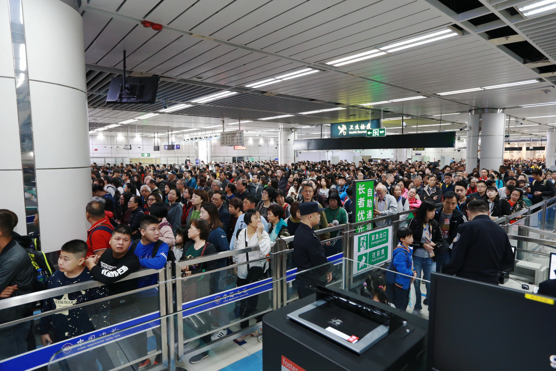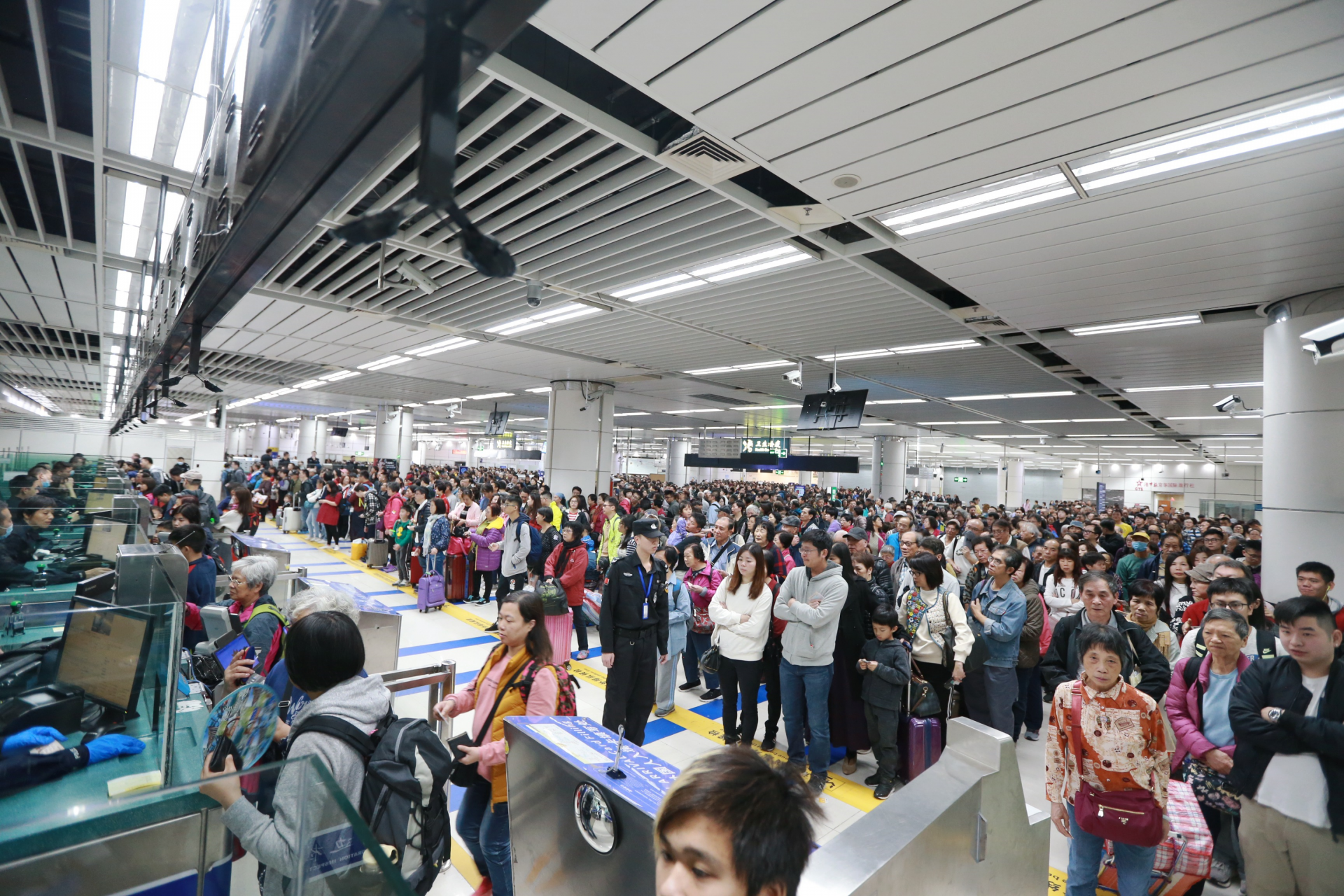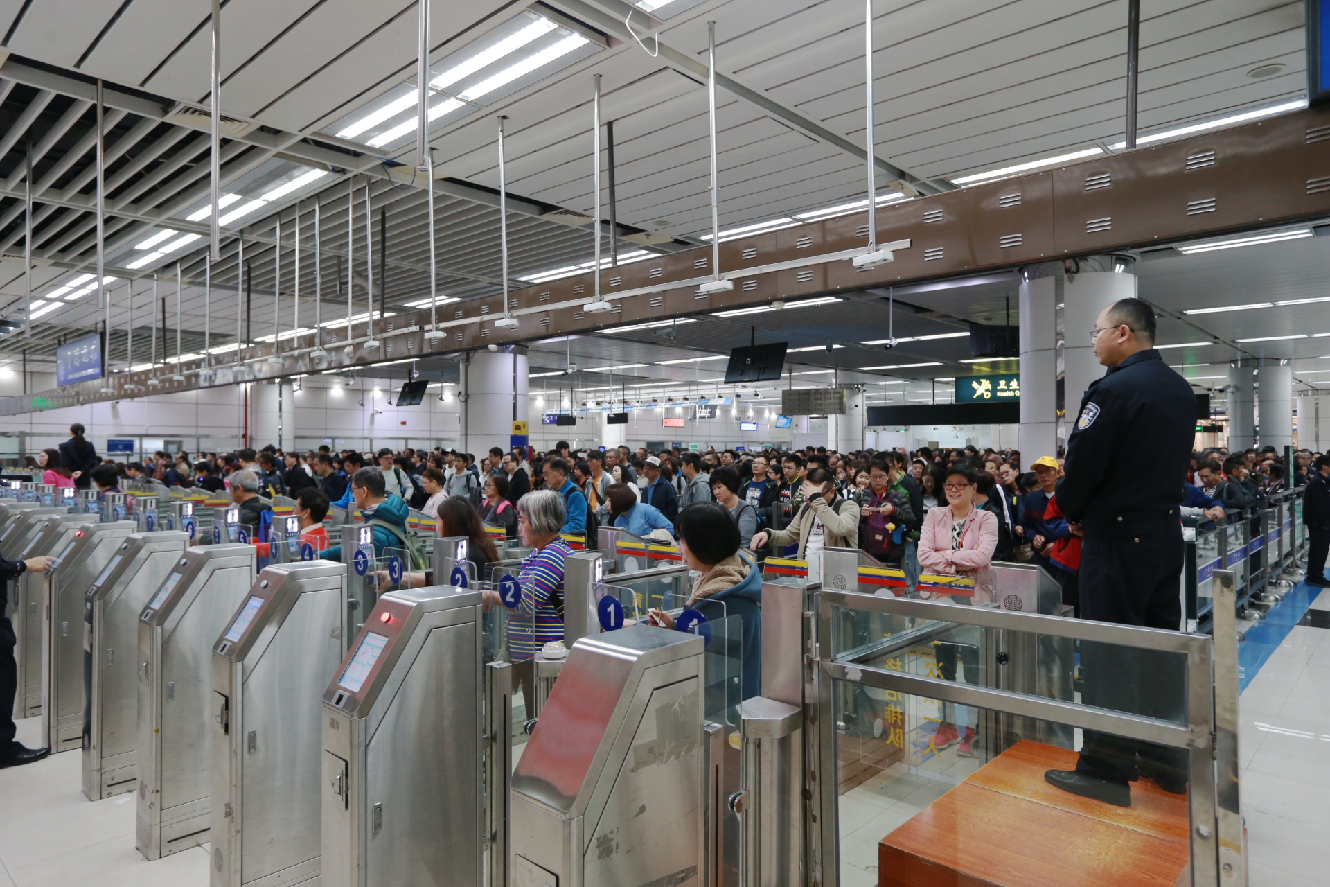 深圳湾边检站虽早已打开全部查验通道,但持续激增的入境旅客,还是很快挤满了整个查验大厅。深圳湾边检站根据现场情况,及时启动应急预案,在开启入境大厅临时查验台的基础上,将出境大厅临时查验台也调拨至入境大厅,全力验放入境旅客。至上午10时许,入境大厅客流达超饱和状态,排队候检的旅客延伸至深港分界线香港一侧。至11时许,客流逐渐平稳,在边检民警全力验放下,入境大厅候检旅客才回落减少。
