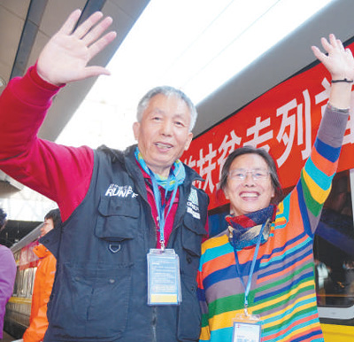 李洪莉和老伴在“京和号”列车前合影。本报记者 贺 勇摄