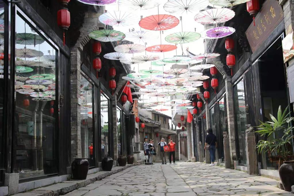 古镇老街上游客在“游子伞”下拍照打卡。新华社记者曹力 摄