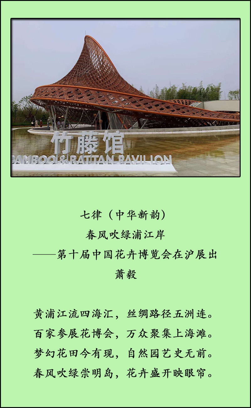 第十届中国花卉博览会在沪展出 黄浦江流四海汇, 丝绸路径五洲连。 百家参展花博会, 万众聚集上海滩。 梦幻花田今有现, 自然园艺史无前。 春风吹绿崇明岛, 花卉盛开映眼帘。
