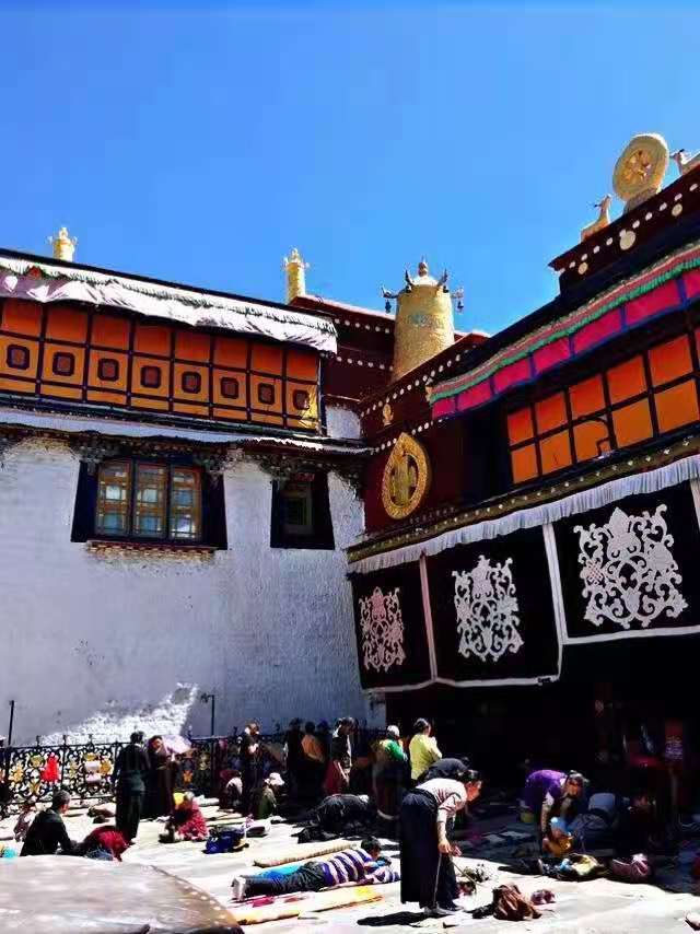 ![]() 今天上午去大昭寺、八廓街。八廓街原来只是信徒顺时针转经的经道,久久长长的信徒在这里一圈一圈的转经便成了街,也就成了拉萨古城,记得尼泊尔也有八廓街,那里的中心是博达哈的大佛塔,也有近700年的历史,但与大昭寺1300多年的历史不能同日而语的。 ![]() 当我真切地站在大昭寺门前时,我被自己的所见吃惊。大昭寺辉煌的建筑,殿宇雄伟,庄严绚丽,广场上转经的信徒虔诚的叩拜着等身长头,门前的青石地板上留下了深深印痕。 一千多年的历史,一千多年的香火,流传了一千多年的大昭寺。 走进寺院是一个天井,我们在这里等候入寺内,这里可以拍照,四周墙上的壁画色彩艳丽,长明酥油灯闪烁着点亮了信徒心中的信仰。 ![]() 继续跟着往前走听着导游详尽的解释,走进松干赞布、文成公主、尺尊公主的殿堂,看到文成公主高耸的发髻,便一眼认出来了,这是唐代贵妇的头饰,同时她披风饮雪赴士蕃的千古绝唱再次在脑海中泛起。 ![]() 朝圣路上是神圣的气场 是震撼心灵的圣洁力量 我们以为烧一炷香 就可以求到佛祖保佑 藏人要用身体一丈丈量出自己的信仰 多少人虔诚到一步叩一个长头 肉身匍匐到尘埃最低处 才可以贴近天穹的神明 我们的祈求是岁岁安康 藏人的祈求是此生心灵净化,吉祥如意 来生灵魂完善,空明洁白 那一刻,他们走过我的身旁,嘴里诵经,手里转经 那一刻,夕阳西下,云卷霞飞,弥漫着酥油般夕阳醇厚味道 那一刻,霞若经幡在天穹飞扬 那一刻,经幡系着佛陀之灵晚风里轻飏 那一刻,天地澄明静谧朝圣者,沐浴在神圣光影里 天地之间,肃穆庄严 仅仅留下了转经筒的光明 和朝圣者虔诚的剪影 ![]() ![]() |