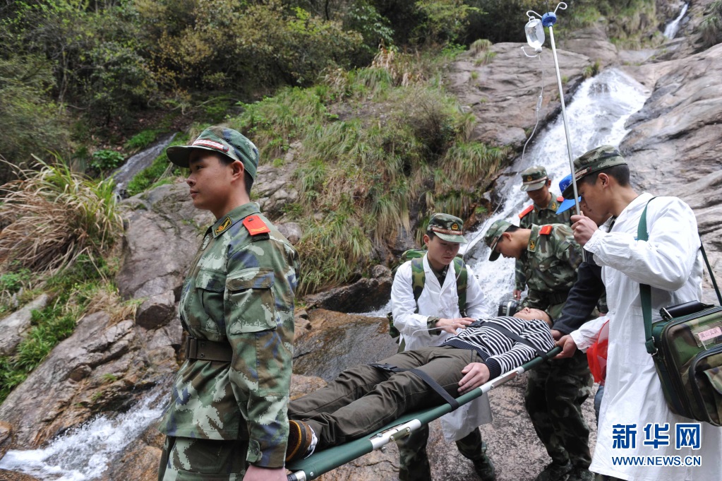 武警官兵在黄山风景区人字瀑景区举行旅游应急救援大演练。新华社照片
