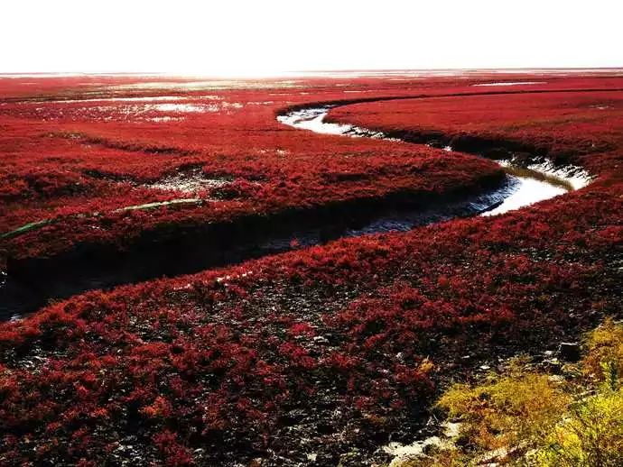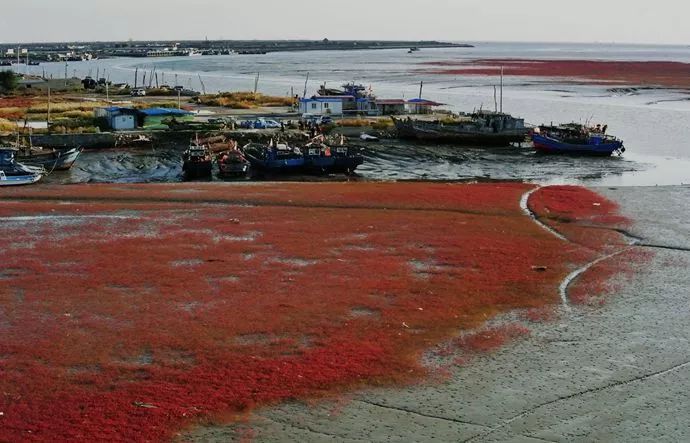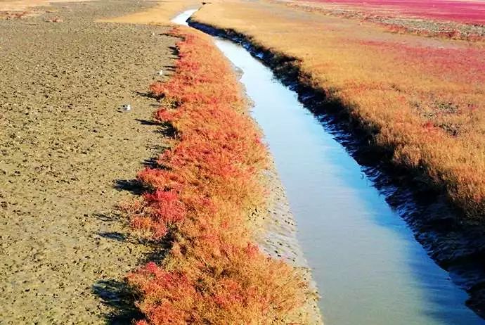 因了河的沉积海的荡涤、盐的浸润碱的渗透,这咸淡交融的滩涂湿地,让盐生植物碱蓬草疯狂生长,织就巨大的红色地毯,从岸边一路铺向海里……浩浩荡荡,势不可挡!