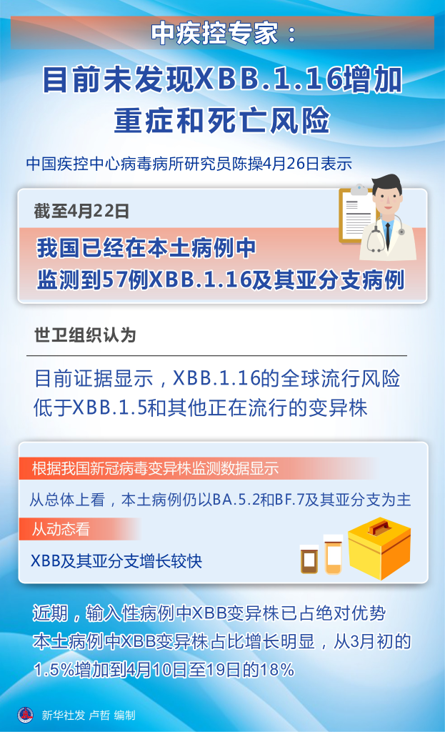 比如,交通运输部门和单位,可以及时增加或者开放进站进场的通道和安检通道,有序引导乘客进站进场乘坐交通工具。 客运场站、商场超市、旅游景点室内场馆等应加大通风换气力度,适当增加公共用品和设施的消毒频次,加强从业人员的健康监测和管理。 学校、养老机构、社会福利机构等重点机构,则应该对出现发热、咳嗽、咽痛等症状的人员,及时安排诊疗和检测,防止在这些机构出现聚集性疫情。 判断三:未发现新变异株增加重症和死亡风险 我国新冠病毒变异株监测数据显示,从总体上看,本土病例仍以BA.5.2和BF.7及其亚分支为主。从动态看,XBB及亚分支增长较快。近期,输入性病例中XBB变异株已占绝对优势,本土病例中XBB变异株占比增长明显。截至4月22日,我国已经在本土病例中监测到57例XBB.1.16及其亚分支病例。 世卫组织认为,目前证据显示,XBB.1.16的全球流行风险低于XBB.1.5和其他正在流行的变异株。 ![]()