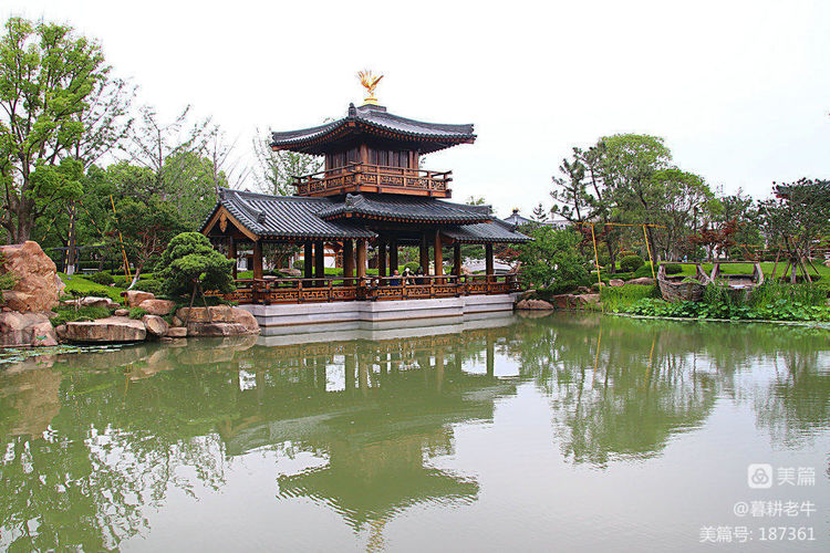 从寺院右侧的小门转过,就来到刚刚对外开放的祗园:又是一处体验唐韵的场所。园内有一泓池水,让所有的唐式建筑都绕着它布局,亭台楼阁,水榭长廊,假山水瀑,都于池边一一铺排开来;加以小桥流水,通幽曲径,疏落而又紧凑,错落却又有致,可借景也可互依,形成你中有我、我中有你的格局,深得中国古代园林的韵蕴。池不大,连着逶迤而行的小河,池中种有莲荷,莲叶田田,铺满了小池之一角。初夏时节,已有一枝着花,粉粉的,尽显雅洁。中国的禅院多种植莲花,哪怕只是盆栽的,也要而于院中,为的是取其高雅廉洁之意,使之与禅院的禅意雅韵相符,岂不见佛主用的正是莲花座呀!