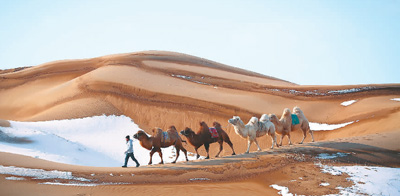 沙坡头景区沙漠雪景。