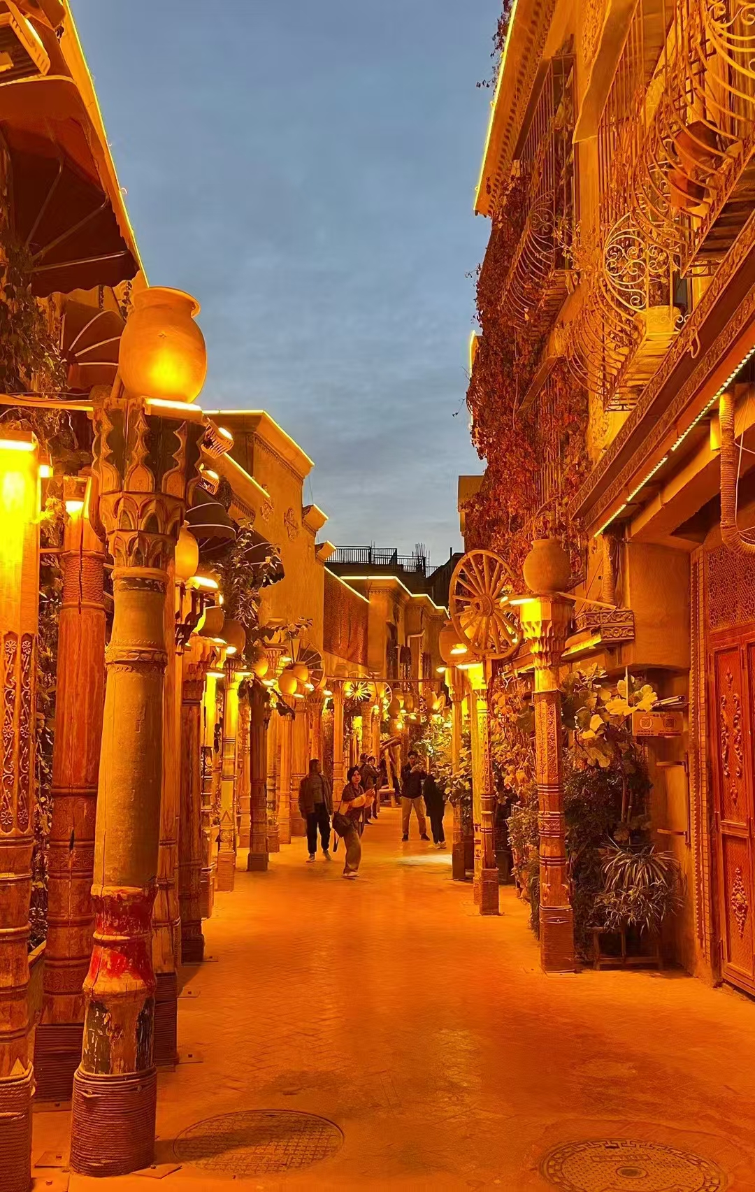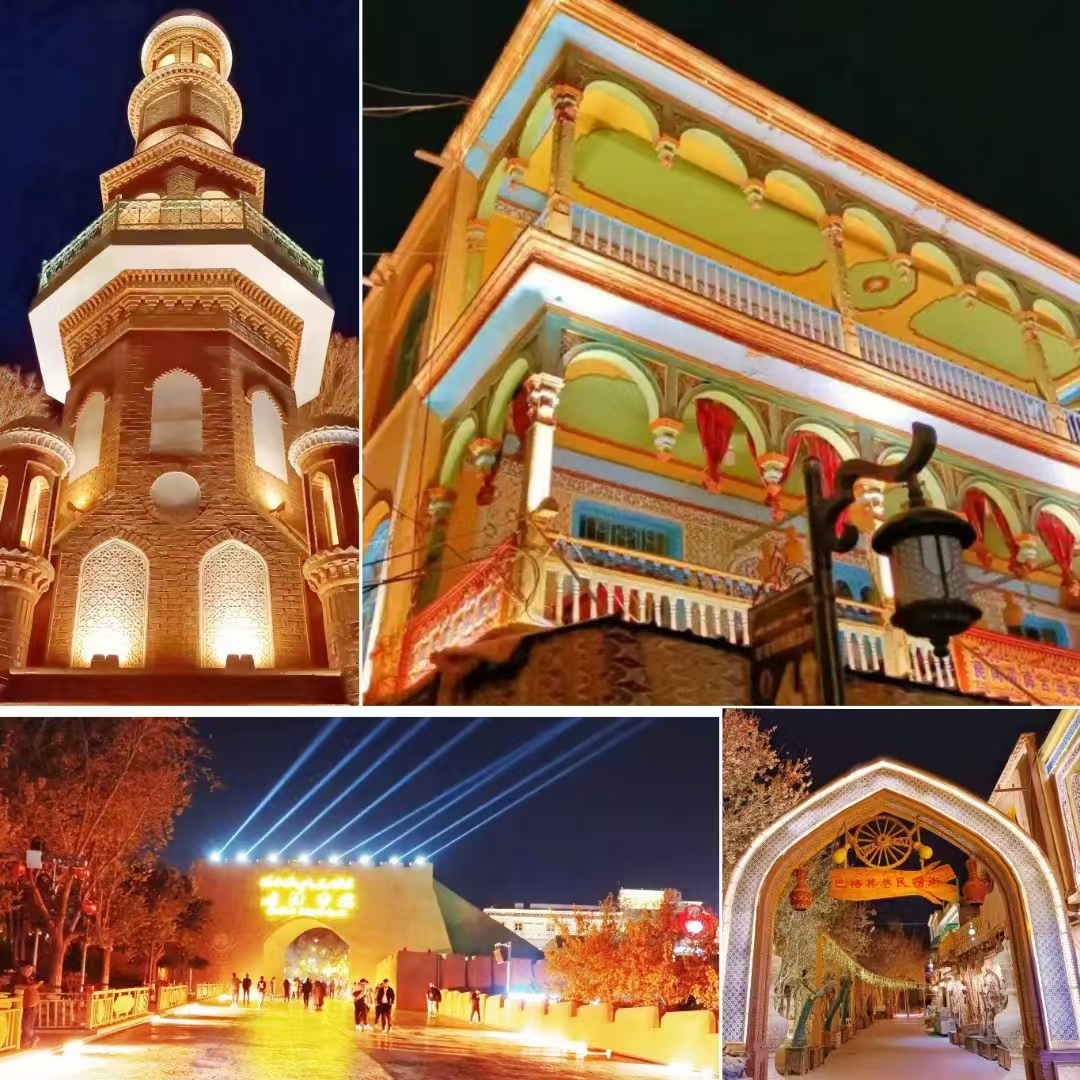 夜,当落日的余晖散尽,喀什古城也开启了新的篇章。夜空下,灯光勾勒出绚烂的线条,将这座“黄沙上的城市”渲染出流光溢彩的别样氛围。古城的灯光如同流动的“星河”,将古老与创新相连结。夜晚这里是流光溢彩的梦幻城堡。