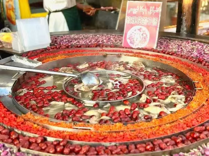 这里滿街琳琅满目餐食,看见那口大铜锅直经一米多,锅壁得有80Cm深,据说可以烧万人的手抓饭。