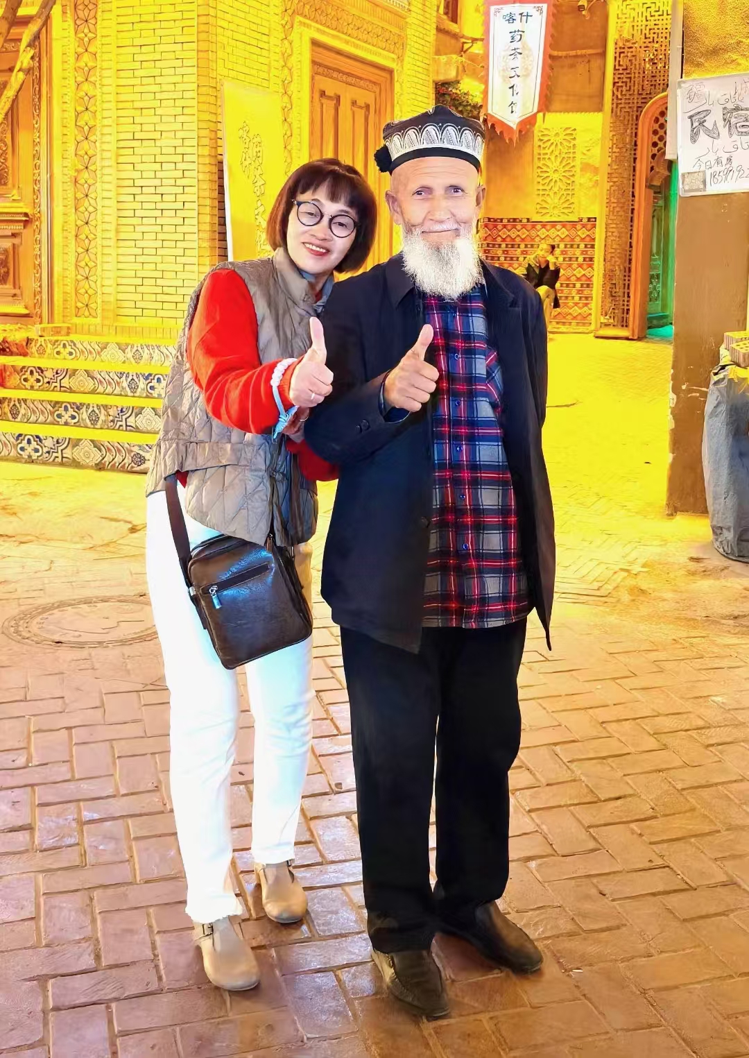 我们彳亍在灯光闪耀街巷中,偶遇了维吾尔网红大爷,赶紧合了一张照片。这网红大爷非常友善,伸出大拇指,是不是显示了汉维友谊。