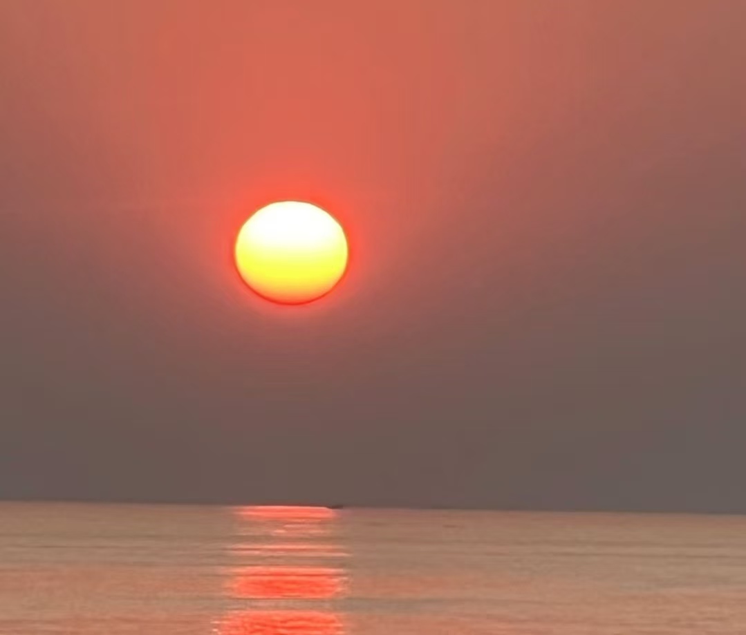 太阳如一个大大的咸蛋蛋黄悬在海平面上,染红了一片天色,一片海水。