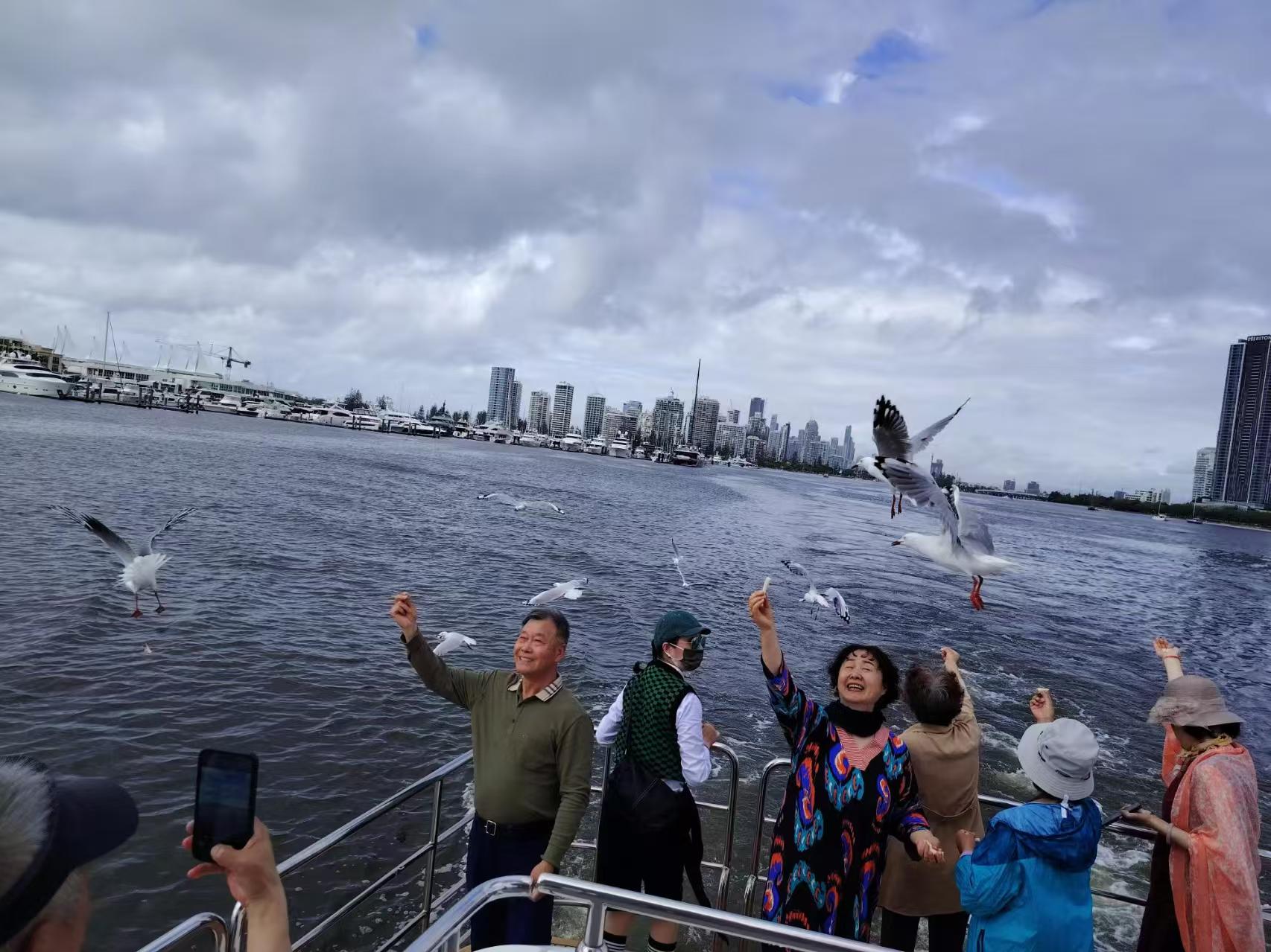 蓝天白云下,我们站在游轮上喂食海鸥,享受着美好的时光。海风轻拂,海鸥的叫声此起彼伏,仿佛在为我们演奏一首大自然的交响曲。这样的场景让人不禁感叹,澳大利亚的自然风光真是令人陶醉。