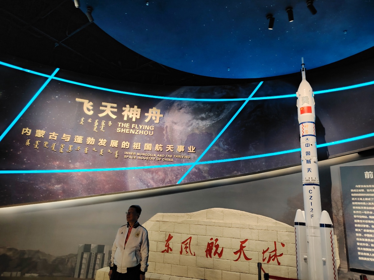 限于时间关系,我们先直奔二楼“亮丽内蒙古”展厅,观赏生态内蒙古的多彩画卷;又进“飞天神舟”展厅,领略内蒙古与祖国航天事业发展的风采,同行的曾在上海航天科研所工作过的黄工欣然与航天器留影;