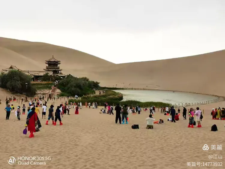 就在即将到达敦煌市时,突然漫天飞舞着风沙,能见度只有十米,感觉就是沙尘暴。我在心中默默祈祷老天爷,千万不要在我们到景点时风沙依旧不停,那就白来了一趟。好在穿过市区来到鸣沙山月牙泉时,风沙停了,仿佛老天爷在眷顾我们这些远道而来的游客。后来听说,那个地方是一个风口,经常风沙弥漫。 虽然已经傍晚六点了(此地晚上九点半才天黑),景区依旧人满为患,放眼望去,沙山上密密麻麻的游客就像蚂蚁一样,骑骆驼的游客一大串行进在沙漠里,像一条长龙蜿蜒,真是巨龙见首不见尾,据说光骆驼就有上千匹。 本人因为曾经在内蒙旅游时骑过骆驼,感觉并不很爽,所以不骑骆驼,与同伴一起去寻找月牙泉“洗心”。神奇的月牙泉像一弯新月静静地俯卧在鸣沙山麓,清澈温顺,水似柔情。其实每一个来到这里的游客,必定是为她而来。骑骆驼,登山,滑沙,甚至乘坐直升机观光,都是为了一睹月牙泉的真容。因为在这干旱高温的沙漠中能够千百年保持着这样的一弯清泉,实为罕见,因为大风是从沙山脚下往上吹,所以月牙泉永远也不会被风沙埋没,这也是造物主的匠心之作。 沙泉与共,山水相偎。真不愧为塞上明珠,西域奇观。我们与鸣沙山共舞,与月牙泉对语,扬一把飞沙,捧一掬清泉,三生有幸也!