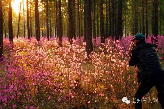 5月9日,在结束对目前呼玛县最北的鸥浦乡老卡、曙光村的考察,从岔道转回到三合至鸥浦乡政府所在地鸥浦村的道路上后不久,两侧出现了长达八里的兴安杜鹃--达子香花海。网摘:达子香,又名兴安杜鹃花、满山红、映山红等。属于杜鹃科。达子香花呈粉红色,简简单单,花分五瓣,并不独立,而是在接近花托的部位连在一起,中有花蕊十一根,其中略显粗壮的为雌蕊,其他十根为雄蕊。花生于枝条的顶端,不像梅花生于枝杆,花期15~20天。置身花丛,早闻其香,味如松油,幽幽淡雅,其味生于枝杆,而非生于花蕊。达子香没有果实,只是靠根系顽强的繁衍。达子香的花序具有药用价值,据药典记载,含有香豆素、氨基酸等,可以解毒润肺、消炎止咳,可预防上呼吸道感染,是绿色的保健饮品。当地居民每到这个时节纷纷采集花瓣,晾晒后储存起来,以花代茶,悠然自得。比较学术的解释:半常绿灌木,高1-2米 ,多分枝;小枝有鳞片和柔毛。叶近革质,散生,椭园形,长1.5-3.5厘米,宽1-1.5厘米,两端钝,顶端有短尖头,上面绿色,有疏鳞片,下面淡绿色,有密鳞片,彼此接触或覆瓦状,叶柄长达2毫米,有微毛,花序侧生枝端(同时也有顶生),有花1-2朵;花芽鳞早落;花梗长8毫米,有微毛,无鳞片;花粉红色,先花后叶,花萼短,外面有密鳞片,花冠宽漏斗状,长约1.8厘米,外面有鳞毛,雄蕊10个,伸出,花丝下部有毛:子房密生鳞片花柱无毛,稍长过雄蕊,蒴果长1.2厘米,矩圆形,有鳞片,花期4-5月,果期8月。