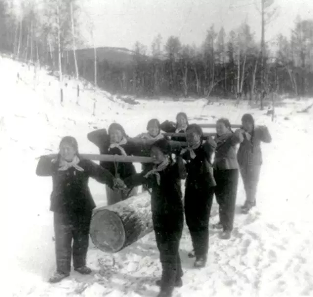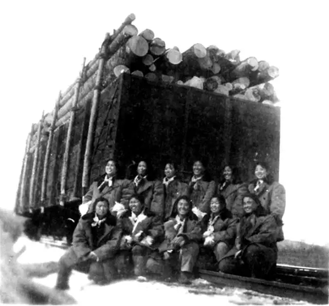 先遣设营 兵马未到,粮草先行。我作为值班一连的副连长,当年10月上旬便随采伐指挥部的领导,拜会了当地林业局,并去山上考察了地形和路况。10月23日晚,我带领值班一连的先头部队及部分车辆、机械及生活物资进山,动手清理场地,砍伐树木,为搭帐篷做准备。一周内,我们共搭建了12米长、6米宽的帐篷三顶,并建起了全部用圆木搭建起来的“木克楞”食堂。采伐尚未展开之时,山上根本没有路,积雪普遍深达半米,这么多木材全靠我们人工放倒后手拉肩扛运回来,由此可见当时的劳动强度之大。 住的问题基本解决了,还要解决行的问题。汽车从山上运木材到贮木场必须通过克一河,否则就要绕行50多公里。指挥部决定在十多米宽的克一河上用圆木架设一座便桥。11月1日起,我带领先遣队的战士们首先在河的两岸打眼装药放炮,炸掉小山包,清理出施工场地,便于推土机发挥作用,同时派出十几名战士在附近的山上伐大树,然后由拖拉机将一根根圆木用钢丝绳套住后拉到河边。11月的大兴安岭已经滴水成冰,虽然异常寒冷,但冰封滑溜的克一河反倒对大圆木的输送减少了阻力。我们二十多人外加几台机械设备每天早出晚归,仅用了八天时间,就完成了这座全部用圆木和“扒锯子”连接起来的桥梁,并于11月8日下午进行了通行试验,通过了指挥部的验收。 ![]() 参加莫尔道嘎采伐的姑娘们