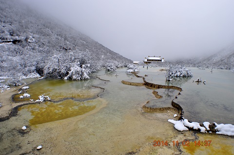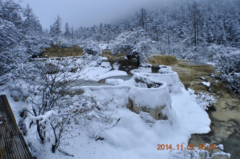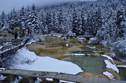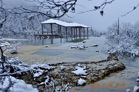 2014年11月2日,清晨5点坐上旅行社大巴驶向黄龙景区,路上足足开了11个小时,快到景区了,但是接到通知,因昨天下雪,上黄龙的山路积雪较厚,不少路面已经结冰,路面湿滑。已有不少大巴车打道回府,能上黄龙的大巴车,都因司机驾车技能高超。当时我们车的游客都在嘀咕,不知今天我们能不能上山,有没有福气看看雪中的黄龙?只见我们的导游和司机商量了一会儿,导游说:我们车的司机驾车水平是一流的,应该能把大家送上黄龙,但是具体路况怎样,司机心里也没底,决定继续上山,实在开不上去那也是没有办法的事,只能不游黄龙了。 车继续向上开,路况确实不好,不光有积雪,还有很多地方积冰了。司机慢慢地开着车,前方出现了七八辆大巴,也和我们一样是上黄龙的,因这段路实在难开,司机们怕出问题,决定大巴一辆一辆分开开过去,等第一辆开过这段路后,第二辆再开过去,就这样,开开停停,终于有惊无险地到达黄龙,也让我们看到了雪中的黄龙是一个什么样的景致。 下面是我拍的一组照片。