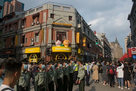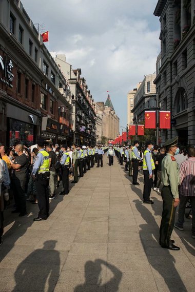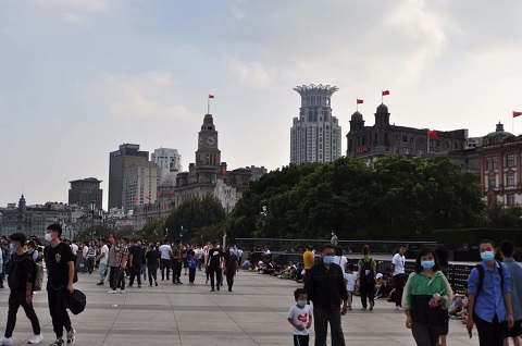 今年中秋节恰逢国庆节,双节来临,喜气洋洋,虽然有疫情的影响,但是仍然阻止不了人们欣喜的脚步,南京路步行街和外滩依然人山人海,武警、交通警、交通协管员在有序地维持秩序,使人群井然有序地观光游览。