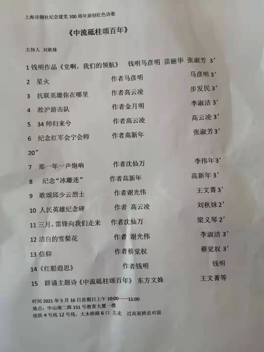 ![]() 主持人 刘秋妹 ![]() 高云凌《34师归来兮》 ![]() 马彦明《星火》 ![]() 李淑洁《洁白的雪梨花》 ![]() 步发民《淞沪游击队》 ![]() 张淑芳《纪念红军会宁会师》 ![]() 蔡觉权《信仰》 ![]() 梁义琴《三月,雷锋向我们走来》 ![]() 王文菁《歌颂邱少云烈士》 ![]() 高新年《纪念冰雕连》 ![]() 钱明《红船遐思》 ![]() 李伟年《那一年,一声炮响》 ![]() 刘秋妹《人民英雄纪念碑》 ![]() 节目单 |