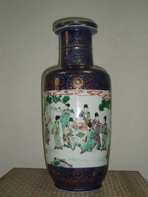 雍正时的《南窑笔记》说:“宣窑。。。又有霁红、霁青、甜白三种,尤为上品。” 清代康雍乾三朝的瓷器生产达到历史高峰。蓝釉同样极具特色。造型多样,有各种瓶、壶、尊、罐、盆、盘、碗、豆、洗等。底部有的署官窑年款,也有不署款。蓝釉清皇室用于天坛祭祀,作为祭天器皿,常称“祭蓝”。民窑器同样是上层社会、官宦豪门之家的宗庙祭器。 祭蓝釉瓷器釉面色调均匀,釉层肥腴,深沉凝重。由于高温下釉层熔融垂流,致使器物口沿釉层变薄,露出白色胎骨,形成一圈醒目白边,俗称“灯草口”。而近足处釉层堆积较厚,显出蓝中带黑。 洒蓝釉,亦以氧化钴为着色剂的高温釉。以喷吹法施釉,犹如在浅蓝色釉地洒上深蓝色水点。又如深蓝地上喷上浅蓝斑点,又称雪花蓝、鱼子蓝、盖雪蓝、青金蓝,创烧于明代宣德年间。宣德洒蓝釉瓷器非常名贵,传世品极少,据报道仅有的二件洒蓝釉盔碗,一件在北京首都博物馆,为镇馆之宝。另一件被侨居瑞士的著名收藏家仇炎之先生收藏。台北故宫博物院还收藏一件宣德洒蓝釉撇口碗。洒蓝釉正德、嘉靖有少量生产,在康熙时重放光彩,常见有花觚、棒槌瓶、观音尊、笔筒、罐、壶、盘、碗等,多为民窑。 康熙洒蓝釉瓷器常以描金装饰,部分洒蓝釉开光,内绘五彩、青花五彩、青花釉里红等花鸟、人物图案。上海博物馆有一洒蓝大棒槌瓶,描金开光,开光内绘五彩花鸟图案,纹饰精细,为著名藏品。 康熙朝以后,洒蓝釉很少生产,直到光绪。民国出现许多仿康熙的洒蓝瓷器,以盘碗瓶器为多。 这件康熙洒蓝釉描画通景五彩人物捧槌瓶,高44厘米,是康熙晚期的精品,器型规整,洗口微凹,直颈中部一道弦纹,折肩,筒腹,收胫,圈足稍宽,釉底青花双圈款,发色内深外浅。胎土陶洗纯净,细腻坚质,胎釉结合紧密,结合处隐显火石红。底部棕眼自然,微见旋削纹。上下两段洒蓝描金,口沿回纹,弦纹处城墙纹,颈部团菊纹,肩部的开光杂宝纹接团菊纹,胫部团菊纹接变形莲瓣纹,描金特细,磨损较少,腹部莹润洁白、肥腴柔和,又缩釉点,通景五彩人物,为唐太宗时期文学馆、房松龄等十八学士围绕琴、棋、书、画成四组画面,润以山石,花草、苍松、祥云。人物头戴黑帽、着皂靴,衣袍红绿黄紫各色,红色略黄透明、黑色乌墨上罩透明釉,均为康熙五彩典型特征,五彩釉面见细小开片,有少许剥落。 ![]() (