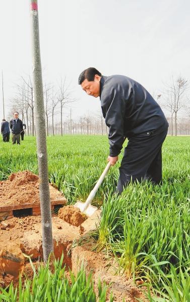 2009年4月1日,时任中共中央政治局常委、国家副主席的习近平在兰考县焦桐园附近一片绿油油的麦田中,植苗、培土、浇水,栽下一棵泡桐树。