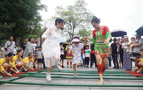 2019年5月1日,游客和黎族姑娘在三亚市南山景区跳竹竿舞。海南省正按照旅游+文化的发展思路,打造开放之岛、绿色之岛、文明之岛、和谐之岛。