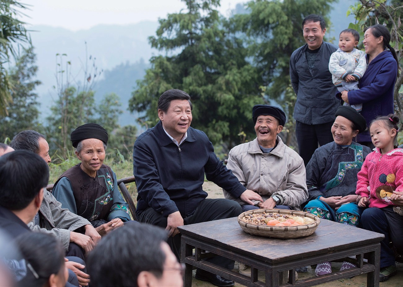2013年11月3日,习近平总书记在湖南省湘西花垣县十八洞村调研,与村干部、村民座谈。