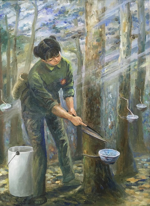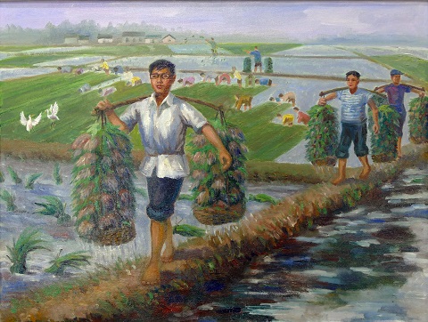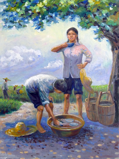 1.插队 姑娘十六岁,下乡当农民,唯有我自知,甜酸苦辣情。 ![]() 2.挑秧 六月种秧天,担重路泥泞,力尽不敢歇,播绿在人间。 ![]() 3.喝水 天热耘稻忙,背灼炎天光,喝碗茶梗水,犹赛甘露尝。 ![]() 4.煮饭 劳动收工后,土灶煮晚饭,灶小地局促,胸怀全世界。 ![]() 5.割胶 上山割橡胶,天暗路不清,日月复日月,胶树泪不尽。 ![]() (责任编辑:晓歌) |