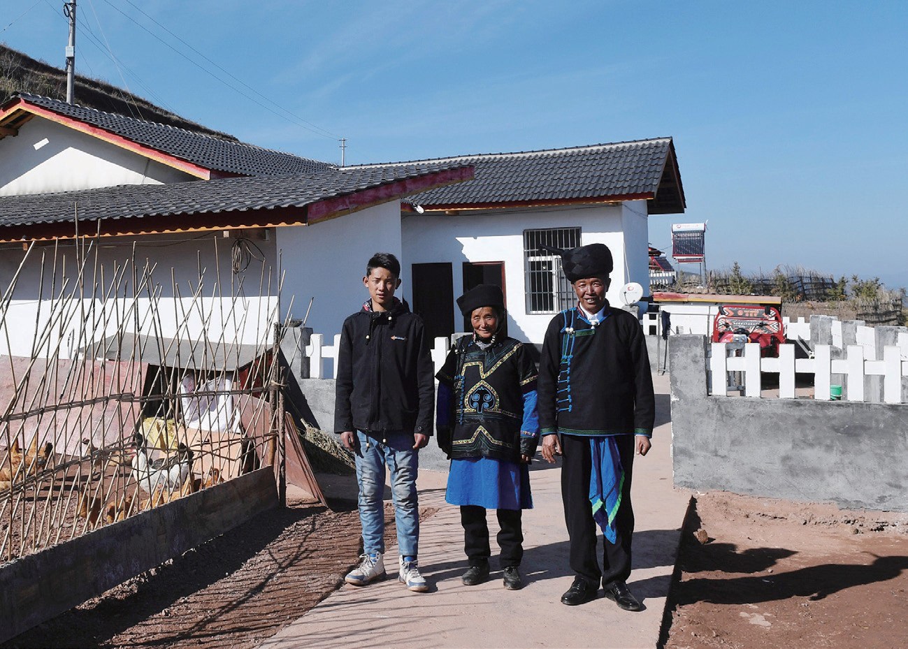 四川凉山彝族自治州昭觉县解放乡火普村村民吉地尔子(右)一家在新家前合影。