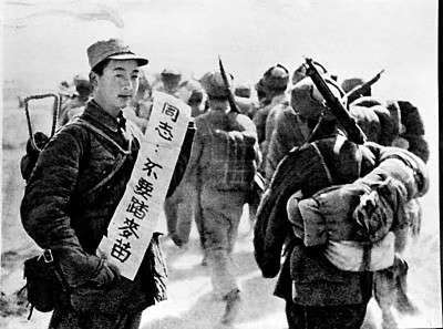 部队在行军途中宣传群众纪律。图片选自《滹沱河畔》