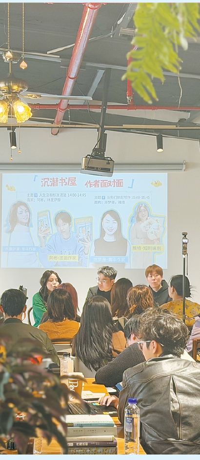 本报记者 施晨露 “我是沉潜读书会的沉潜,也是i人‘沉潜’。”这是95后河南小伙张冠昌对自己的介绍。 i人,在年轻人喜欢的MBTI性格测试中,代表内向、内敛,甚至有点“社恐”。 今年3月,是张冠昌来上海的第七年,也是他创办沉潜读书会的第四年。24小时开放的沉潜书屋在距离苏州河畔不远的一家创意园区正式运营。 从数百场从阅读出发的活动,到城市深夜为阅读者留的一盏灯,在大都市上海,这个略微“社恐”的年轻人是怎样把读书这件事做成大家的事的? 读书,要沉潜 3月14日,位于长宁区华联创意广场的沉潜书屋正式开业。青年作家对谈、特展、音乐会、微醺派对……从上午持续到晚上,把100平方米的空间填得满满的。 来分享的作家是参加过之前读书会活动的嘉宾,来演出的乐队是书友组建的,忙前忙后如同主人般接待读者的很多也是读书会的多年书友,80后潘潘就是其中之一。之前,她已经来过书屋帮忙整理图书上架,“一边整理一边翻,好几本书立刻就想读。”潘潘笑道,书屋是让她对阅读“种草”的地方。 “坦白说,现在大部分时间都给了手机。我不刷抖音,但也还有其他平台,推送的内容会吸引你看完一条又点开另一条。”潘潘说,自己曾经也算得上一个爱读书的人,“但人性挡不住算法,渐渐地就不太读了”。 读书会,是她主动屏蔽信息流的尝试。发现沉潜读书会活动信息后,“观察了好一段时间”,两年前的秋天,她终于决定报名参加。“我也是i人,挺谨慎的。那次活动出乎我意料,大家分享、讨论得真诚、热烈,一点没有不适应的感觉,很快融入了。” 读书活动那么多,为什么在沉潜读书会待了下去?对记者的问题,潘潘想了想回答:“‘沉潜’挺实在的,重要的是,他真的是一个喜欢读书的人。” 沉潜书屋长宁店目前上架了一两千册书,有张冠昌自己的藏书,也有书友捐赠的。在书架上随手拿起一本,翻开扉页,右下角写着“2013年”,还有一枚小小的“沉潜藏书”章。 “沉潜”是张冠昌用了多年的笔名,这个从农村走到大城市的小伙以此鼓励自己“沉下心,潜进去”。“后来发现,这句话也很适合阅读这件事”,沉潜书屋靠窗有一排座位,抬起头就能看到玻璃窗上的一行字——“读书,要沉潜”。 2022年7月30日,沉潜读书会第一期在中山公园举办。巧合的是,距离现在的店址不到一公里。“仿佛命运把我们带回来。”张冠昌笑道。 真诚是必杀技 沉潜读书会的开始,颇有戏剧性。 张冠昌清楚记得,那天一早,上海下大雨。“两个已经报名的书友一直安慰我,就算下雨,他们也会来的。”中午,雨停了。 打开手机相册,他找出四年前的照片,照片上九个年轻人凑在镜头前,笑容灿烂。“这个、这个、这个,还有这个,他们到现在还一直来参加我们的活动。”张冠昌指着照片告诉记者。 那天,在中山公园的凉亭里,九个年轻人聊自己喜欢的书,整整聊了四个小时,地上铺的野餐垫放着几瓶水和零食,手边是驱蚊液,下过雨的夏日午后,要和蚊虫作搏斗。 怎么想到办读书会?张冠昌归结为“不满足”。大学毕业一年,他先在苏州工作,后来到了上海,加了几个读书群,也参加过线下读书会,“感觉比较模式化,主持人先开场,每个人发言时间有限制,到时间了会提醒下一位”。他想要一个更加自由、尽兴分享的读书会,恰好那段时间很多人想去户外活动——去草坪读书,时间空间都不受限,“想到了,就去做了”。 不过,当时的张冠昌没想到,一个i人发起的读书会可以一期期办下去。“头几次读书会,我都要把开场白写下来,去的路上就在地铁上默念。后来有书友告诉我,一开始我主持的时候,手都在发抖。” 诚如人们常说的那句话:“真诚是必杀技”,一年间,沉潜读书会规模越来越壮大,书友群涨到1000多人,张冠昌决定开始全职运营读书会。 一周至少一场,有时两场,沉潜读书会辗转于公园、咖啡店。加入没有门槛,如果在咖啡馆活动,就点一杯饮品。静安寺附近一家咖啡馆的二楼,“沉潜”带着书友们去得最多。“有时候报名的人多,一个下午要分成几组,大家要凑得很近说话才能听清楚。” 比起物理距离上的接近,让年轻人很快拉近心理距离的,还有交流的真实温度。“为什么是读书会?生活中遇到的很多困惑与课题,往往能在书里找到回应或启示。”张冠昌说,沉潜读书会的书友年龄跨度很大,但主力还是90后、00后,大家坐下来,从“我的困惑”聊起彼此在成长、职场、关系或自我探索里反复遇到的问题,常常能得到共鸣,互相启发。 加入读书会,可以成为分享者,也可以旁听,张冠昌总在观察,只要有人想表达,就适时抛去机会。“或许你是什么样的人,就会办出什么样的读书会。”在这个信息多元的时代,无论是吸收知识的需求还是获取书单的方式,都有太多途径可以满足,“稀缺的是面对面的即时反馈与互动,彼此真诚以待的‘人味儿’。”张冠昌分析道。 比别人“快一步” 记者关注到沉潜读书会,是一年多前“沉潜”发出的一则闭店通知。 “既然在咖啡馆办活动,点饮品一个月也要六七千元,再添一点,不就可以租一个空间?”出于这样的考虑,2024年3月,沉潜读书会在田子坊有了固定的落脚点。 这是沉潜读书会的第一家线下店,书友们的“精神充电站”。活动虽然热闹,到了年底,张冠昌还是“被现实打了脸”。满怀歉意发出的闭店通知里,他写道,“我们的收入已无法覆盖书屋的运营