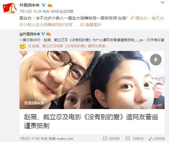 东方网7月15日消息:今日赵薇执导的新电影《没有别的爱》发声明称将撤换主演戴立忍。声明中称导演和投资方都希望戴立忍先生可以给公众更充分的说明,以及在大是大非上有明确的表态,但多次沟通后,戴立忍先生直到昨晚态度依旧模糊,为此导演和投资方集体决定,撤换本部电影的男主角戴立忍。 声明中还表示:“我们都是中国人,坚决维护祖国统一大局,国家利益高于一切,海峡两岸同根同祖,艺术无边际,但艺术家要有情感和态度,每一种文化最终都是来源于她的土壤,服务于她的人民!尤其在国家和民族大义上来不得半点虚假,也不容许任何模棱两可”。同时还为用人失察向广大网民致歉。 【新闻多一点】 国台办:绝不允许少数人在大陆赚钱同时支持“台独” 2015年12月30日,国台办举行例行发布会,发言人马晓光对就“台湾有人一面在大陆投资赚钱,一面却资助‘台独’的活动”回应称,我们支持和鼓励两岸各领域交流合作,实现互利双赢。但是,我们绝不允许少数人一面在大陆赚钱,另一面却支持“台独”分裂活动,破坏两岸关系。 此外,共青团中央官方微博也曾对此次事件发表长文,《赵薇、戴立忍及电影<没有别的爱>遭网友普遍谴责抵制》。