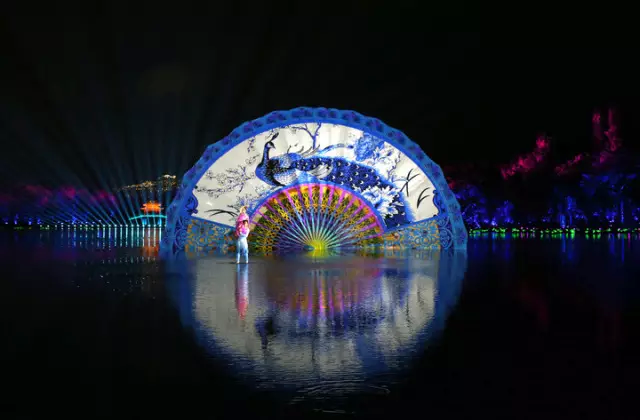 演出现场要用灯光配合这把扇子展开,才能达到最美的效果。