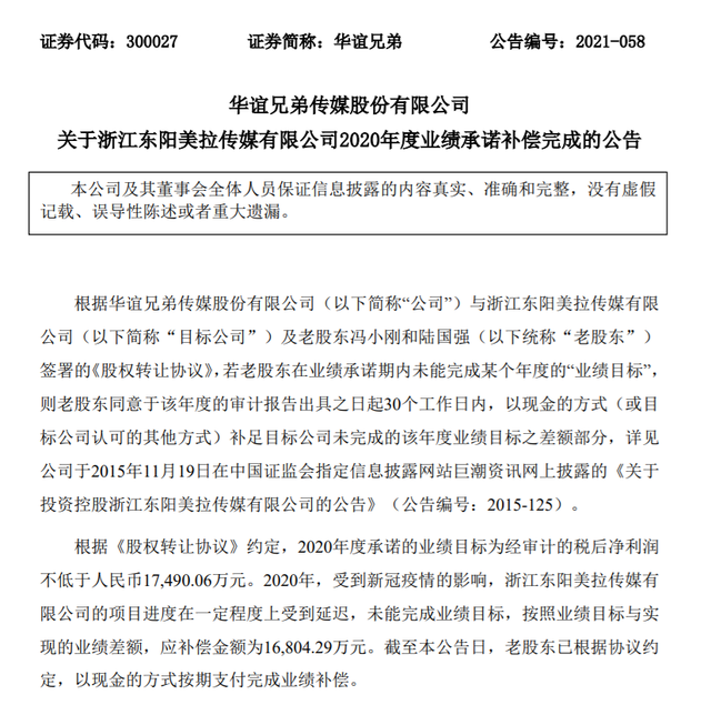 就在其在年报披露半个多月后,5月17日晚间,深交所就2020年年报向华谊兄弟发放问询函,提出19项问题,其中第二项直指与冯小刚对赌未完成一事。 5月24日晚间,在回复函原定披露的截止时间临近之际,华谊兄弟宣布将延期回复问询。 虽然投资者们未能等到年报问询回复函,不过,华谊兄弟对于此前市场热议的“冯小刚业绩补偿款”一事率先进行了单独回应。 据称,截至公告日,浙江东阳美拉传媒有限公司(下称“东阳美拉”)相关业绩承诺补偿款1.68亿元已经到账。 冯小刚1.68亿已到账 24日,华谊兄弟发布关于浙江东阳美拉传媒有限公司2020年度业绩承诺补偿完成的公告。公告称,根据华谊兄弟传媒股份有限公司与浙江东阳美拉传媒有限公司及老股东冯小刚和陆国强签署的《股权转让协议》,若老股东在业绩承诺期内未能完成某个年度的“业绩目标”,则老股东同意于该年度的审计报告出具之日起30个工作日内,以现金的方式(或目标公司认可的其他方式)补足目标公司未完成的该年度业绩目标之差额部分。 根据《股权转让协议》约定,2020年度承诺的业绩目标为经审计的税后净利润不低于人民币17,490.06万元。2020年,受到新冠疫情的影响,浙江东阳美拉传媒有限公司的项目进度在一定程度上受到延迟,未能完成业绩目标,按照业绩目标与实现的业绩差额,应补偿金额为16,804.29万元。截至本公告日,老股东已根据协议约定,以现金的方式按期支付完成业绩补偿。 ![]()