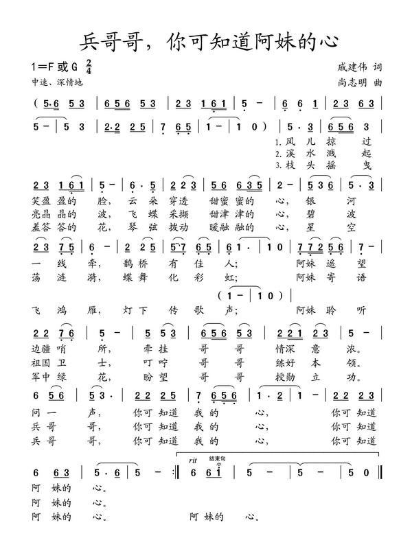 风儿掠过笑盈盈的脸, 云朵穿透甜蜜蜜的心, 银河一线牵, 鹊桥有佳人; 阿妹遥望边疆哨所, 牵挂哥哥情深意浓。 问一声, 你可知道我的心, 你可知道阿妹的心。 溪水溅起亮晶晶的波, 飞蝶采撷甜津津的心 碧波荡涟漪, 蝶舞化彩虹; 阿妹寄语祖国卫士, 叮咛哥哥练好本领。 兵哥哥, 你可知道我的心, 你可知道阿妹的心。 枝头摇曳羞答答的花, 琴弦拨动暖融融的心, 星空飞鸿雁, 灯下传歌声; 阿妹聆听军中绿花, 盼望哥哥授勋立功。 兵哥哥, 你可知道我的心, 你可知道阿妹的心。 ![]() ![]() ![]() ![]() ![]()