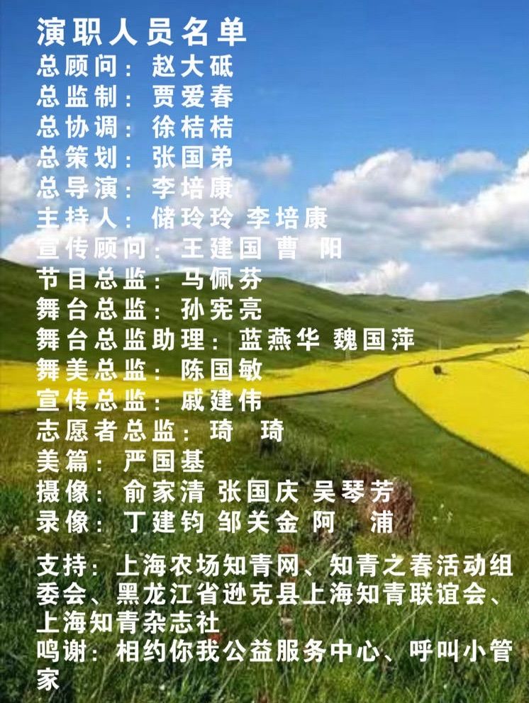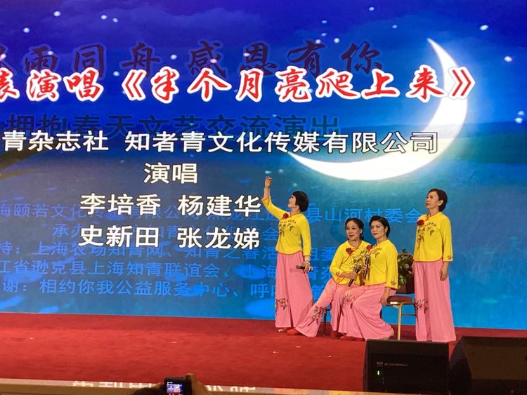 ![]() 三、笛子独奏《牧民新歌》 演奏:知青之春艺术团 丁建泽 ![]() 四、舞蹈《难忘的那一天》 表演:东方知青弘扬舞蹈队 ![]() 五、口琴六重奏《幸福进行曲》《我像雪花天上来》 演奏:逊克县松树沟乡上海知青 朱鸿帮等 ![]() 六、女声表演唱《半个月亮爬上来》 演唱:上海知青杂志社 李培香等 ![]() 七、小提琴独奏《庆丰收》演奏:张新民 ![]() 八,《骏马奔驰保边疆》 ![]() 九、舞蹈《我的祝福你听见了吗》 表演:传刚海派文化艺术交流中心舞蹈队 ![]() 十、男声独唱《母亲》演唱:李培康 ![]() 十一、沪剧《弹吉他的姑娘.情似江河水长流》 演唱:马佩芬 金颂 ![]() 十二、红歌表演《红色帽徽红领章》《日月同光》 《映山红》表演:逊克县奇克镇山河村秧歌队 ![]() 十三、舞蹈《我们中国》表演:稻花香艺术团 ![]() 十四、女声小合唱《再见吧妈妈》、男声小合唱《毛主席的战士最听党的话》 演唱:红色战友艺术团 ![]() 十五、男声小合唱《毛主席的战士最听党的话》红色战友艺术团 ![]() 十六、男声独唱《红星照我去战斗》演唱:董国庆 ![]() 十七、鄂伦春舞蹈《高高的兴安岭》表演:逊克县奇克镇山河村秧歌队 ![]() 十八、葫芦丝演奏《夜色版纳》表演:新江湾城街道葫芦丝艺术团刘以洁等 ![]() 十九、双人舞《军民鱼水情》表演:董卫国 罗家维 ![]() 二十、萨克斯独奏《这世界那么多人》 演奏:逊克县山河村上海知青 欧阳令国 ![]() 二十一、现代京剧《沙家浜 .智斗》演唱:吴似雯 孙宪亮 潘阿华 ![]() 二十二、女声独唱《我爱你中国》演唱:王亚萍 ![]() 二十三、朗诵《祖国是什么》作者:路遥 朗诵者:储玲玲 李培康 ![]()