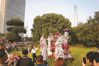 演艺大世界“公园里的莎士比亚”演艺市集上,乌龙剧团《第十二夜》巡游吸引市民游客驻足观看,并与演员互动。 记者 海沙尔 摄